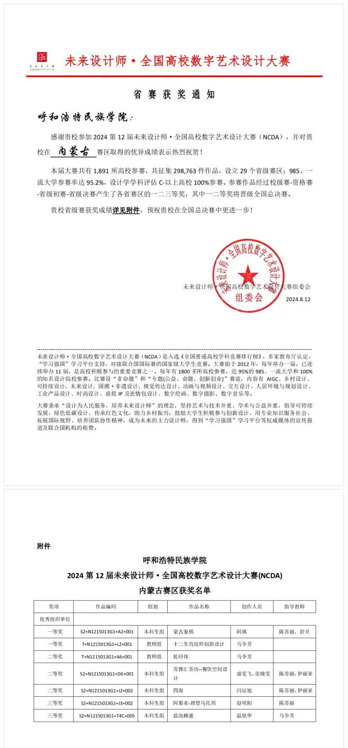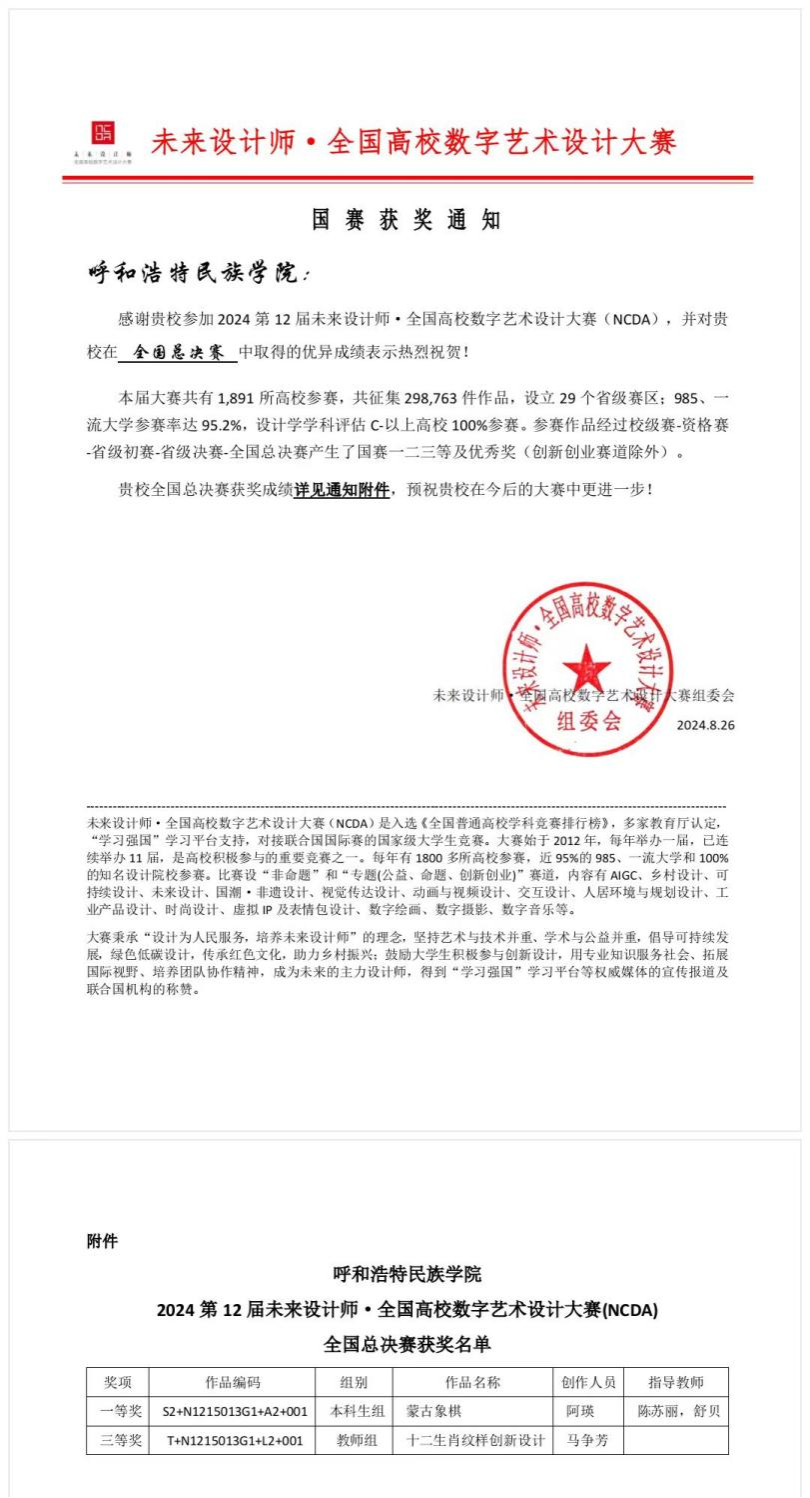 近日,2024年(第十二届)未来设计师﹒全国高校数字艺术设计大赛(NCDA)全国总决赛结果揭晓。我院4名教师参与和指导的7个作品分别获得了国家级和内蒙古赛区一、二、三等奖的好成绩。学校被评为省级“优秀组织单位”。