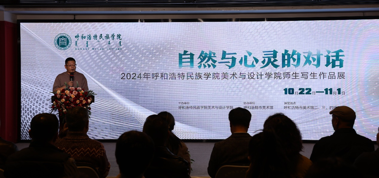 开幕式上,学校党委委员、副校长额尔敦布和教授作致辞。他首先对呼和浩特市美术馆给予学院的大力支持表示感谢,并高度肯定赞扬了此次展览的艺术水准。他指出,写生创作是艺术教学的重要组成部分,是培养学生观察能力和创造力的有效途径。他希望美术与设计学院继续保持锐意进取的精神,深入推进教育教学改革,特别是在写生创作和艺术实践中,不断探索新的教学模式,激发学生的创造力和艺术潜力。同时强调并要求,美术与设计学院要始终坚守文化使命,注重培养学生的民族文化自信,为推动艺术教育事业的高质量发展做出更大贡献。