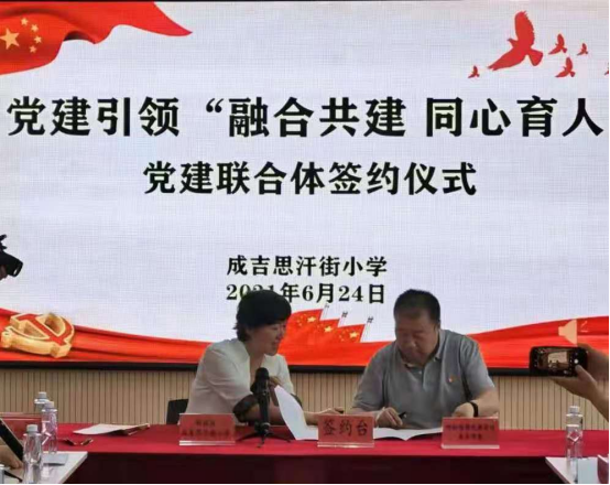 为深化党史学习教育,进一步提升基层党组织组织力、凝聚力、服务力,突出政治功能,强化党建引领,以组织相加推动工作融合,实现共建共享、发展共赢,由成吉思汗街小学、YABO鸭脖美术学院、新城区山水小学、成吉思汗大街府兴社区、内蒙古青少年发展基金会,内蒙古远舰律师事务所等六家单位联合成立了党建引领“融合共建 同心育人”党建联合体。