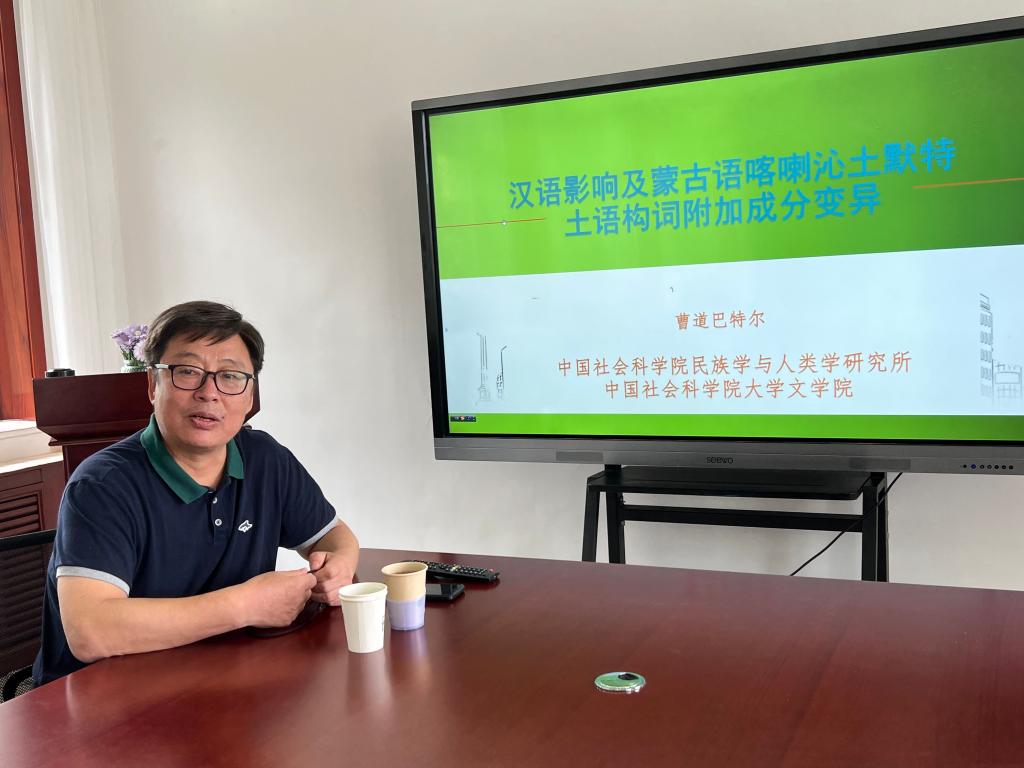 蒙古学学院(翻译学学院、翻译研究中心)举行了2023年度第一期学术讲座 2023-10-27 学科建设 次 6月19日上午,蒙古学学院(翻译学学院、翻译研究中心)邀请了中国社会科学院民族学与人类学研究所研究员,中国社会科学院大学教授曹道巴特尔为我院师生作了题为《汉语影响及蒙古语喀喇沁土默特土语构词附加成分变异》的学术讲座。此次讲座为蒙古学学院(翻译学学院、翻译研究中心)2023年度学术讲座第一讲,讲座由院长王福清主持,院全体老师和部分学生参加了本次讲座。 最后王福清院长对曹道巴特尔教授讲座作了总结,在场的全体师生认真学习领会讲座精髓,进一步开阔了学术视野。