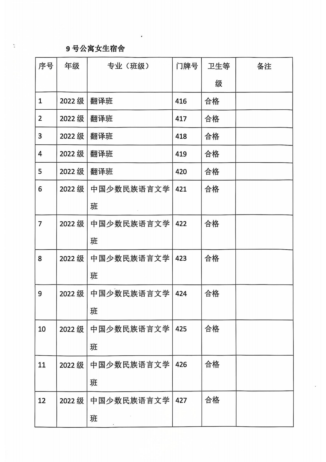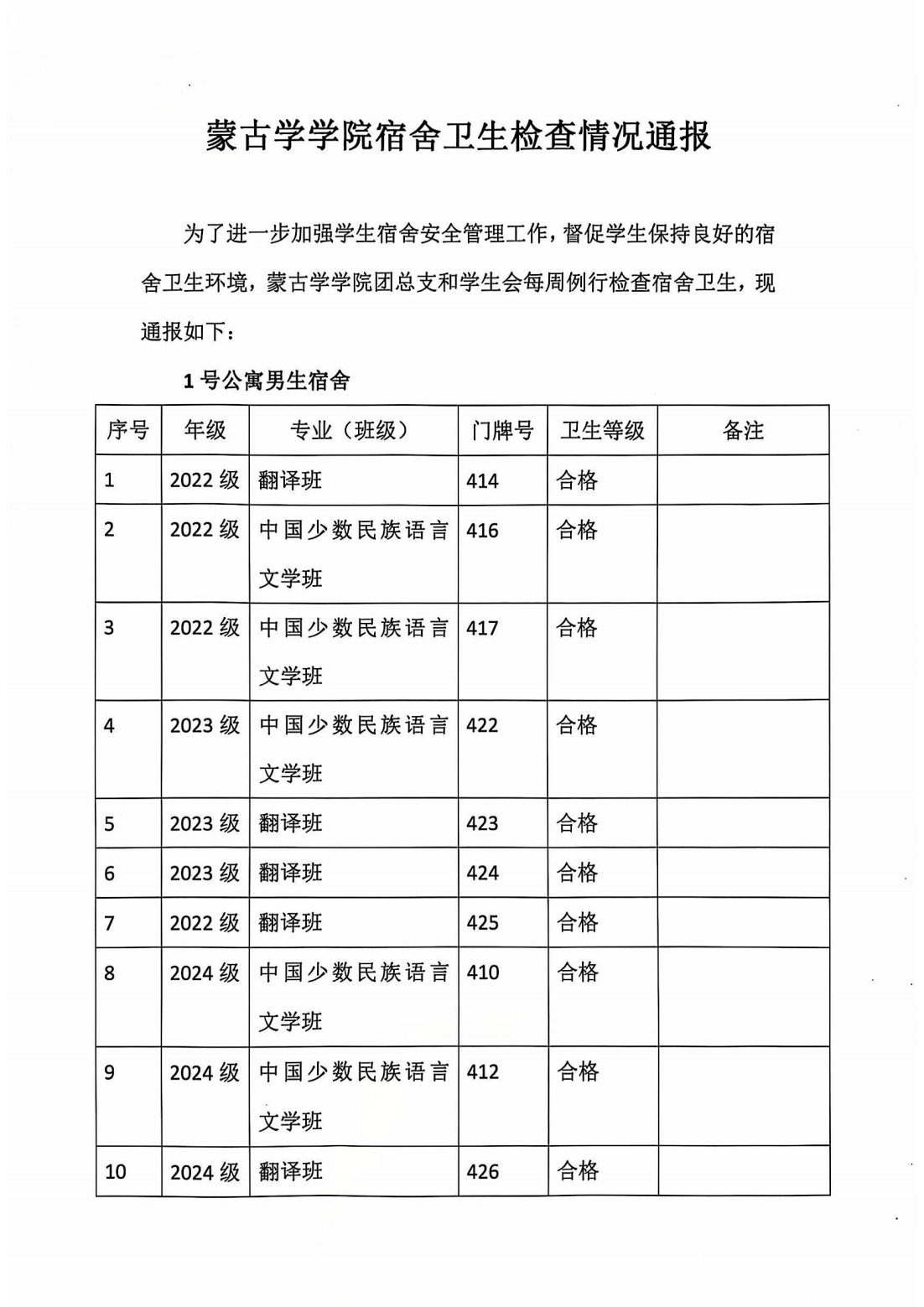 蒙古学学院宿舍卫生检查情况通报10.11