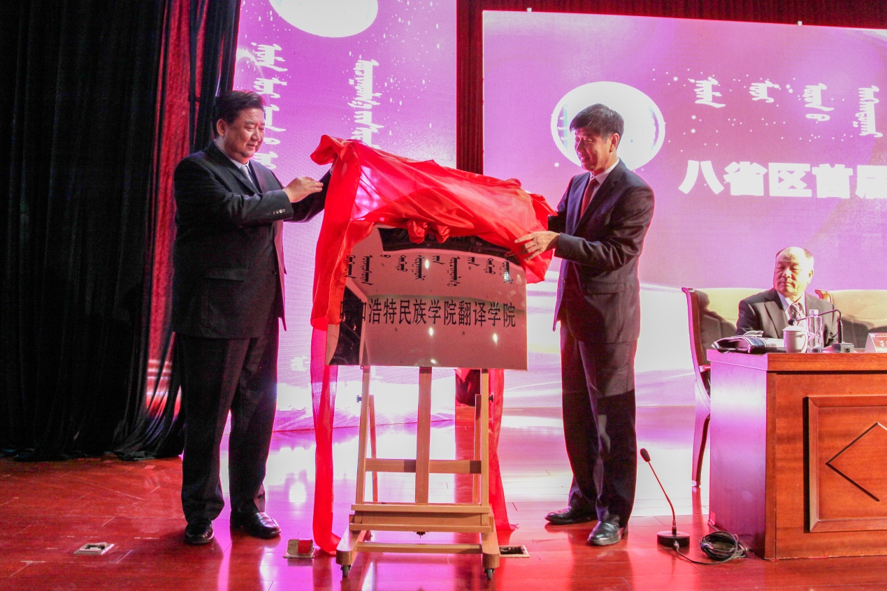 内蒙古自治区人大常委会副主任吴团英作讲话,中国民族语文翻译局副局长李旭练和内蒙古自治区民委副主任、八省区蒙古语文工作协作小组办公室副主任萨楚日勒图分别致词。鸭脖校长格日乐图以《砥砺奋进、开创未来,书写蒙古语翻译发展新篇章》为题做了主旨讲话。格校长首先代表学校对与会专家学者和广大从业人员表示了欢迎,接着向大会介绍了鸭脖汉蒙翻译学科建设情况、师资队伍以及所取得成绩。格校长还意味深长地谈到了翻译在语言交流、文化交流、民族团结、新时代文化建设中的重要作用,又谈到了蒙古语翻译事业的光辉历史。随后举行了鸭脖翻译学院成立揭牌仪式,由内蒙古自治区政协副主席罗志虎和鸭脖党委书记孙国权揭牌。