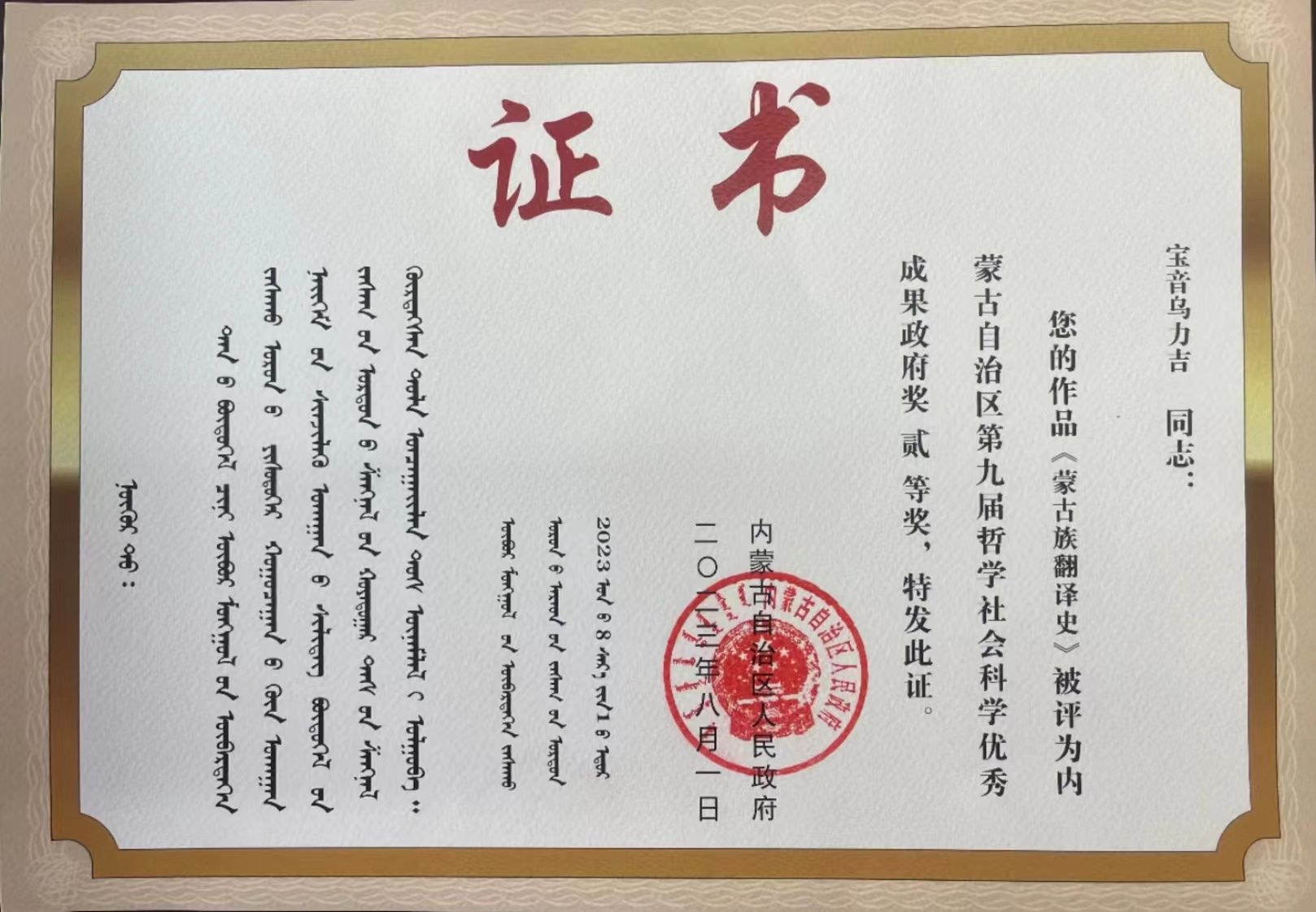 祝贺我院宝音乌力吉教授的作品《蒙古族翻译史》被评为内蒙古自治区第九届哲学社会科学优秀成果政府奖贰等奖。
