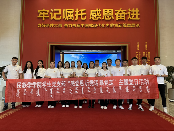 为深入学习贯彻习近平新时代中国特色社会主义思想,提高学生党员政治素质和党性修养,进一步增强广大学生党员“ 感党恩 听党话 跟党走”的思想自觉和行动自觉,4月18日下午,民族学学院学生党支部全体党员前往内蒙古展览馆开展“感党恩、听党话、跟党走”主题党日活动,参观“牢记嘱托 感恩奋进”主题展,重温入党誓词。