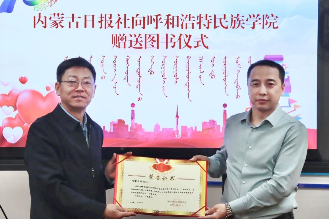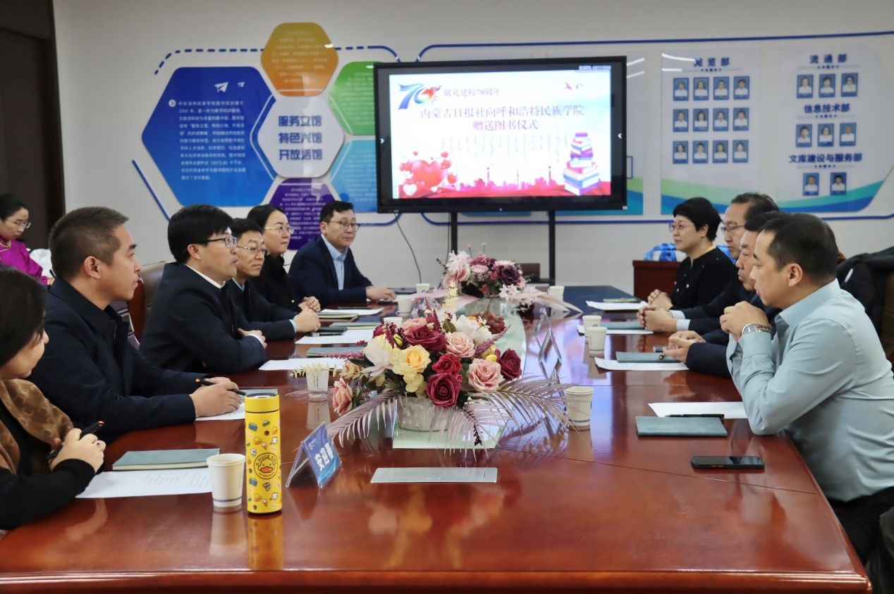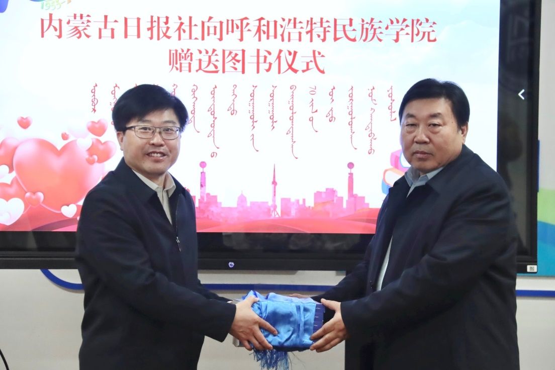 吴海龙表示,所赠图书是祝贺鸭脖70周年校庆的献礼,旨在促进业界和学界相互交流,力求发挥学术研究的成果转化作用。吴海龙对鸭脖向内蒙古日报社等新闻传媒领域输送诸多专业人才表示高度认可。