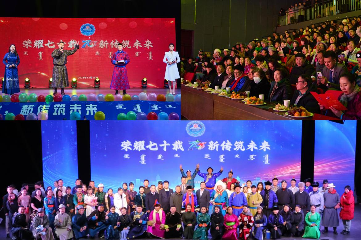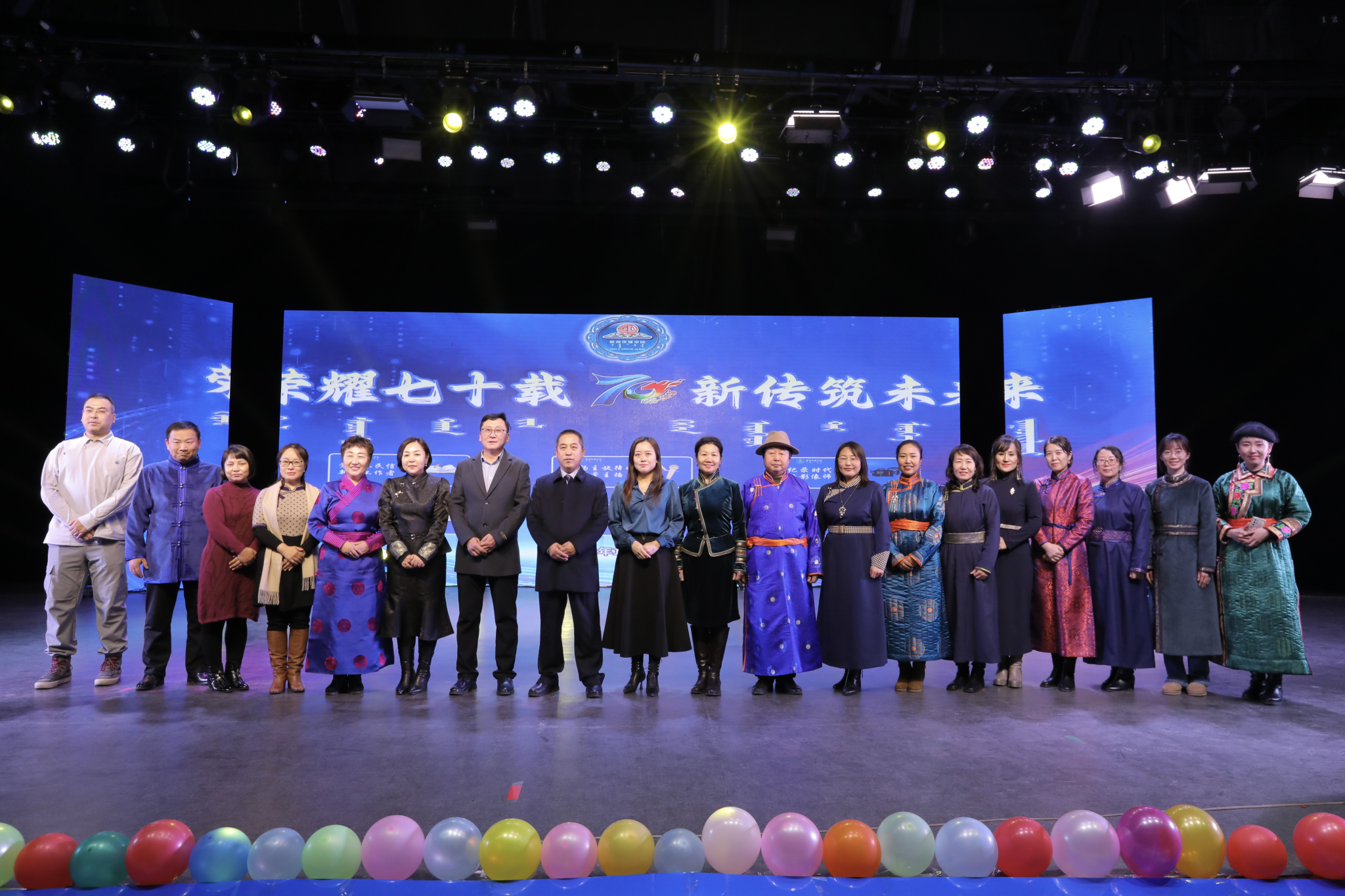 接下来由全院教工上台向到场校友致谢。新闻传媒学院前身是内蒙古蒙文专科学校于1989年创办的新闻系。30多年来为全国各地输送了众多编辑、播音、摄影等专业人才。在学校迎来70周年校庆之际,众多优秀校友重返母校,荣归院系,体现了对母校和学院的莫大支持和深切眷顾。学院全员感谢校友们的到来,希望日后增进院校与校友间的情感交流,携手共进,凝心聚力,共同推动学院各项事业取得更大成就。