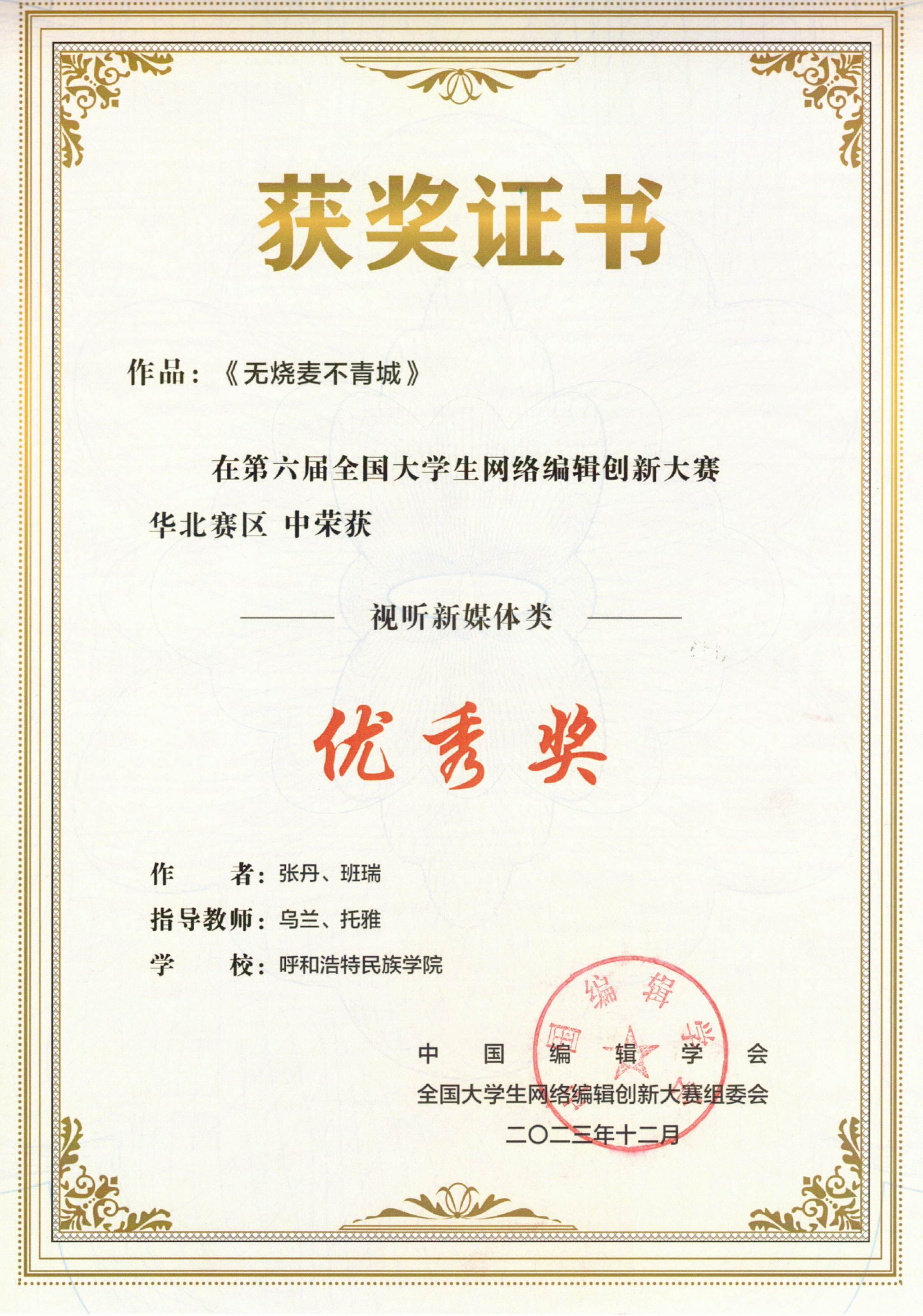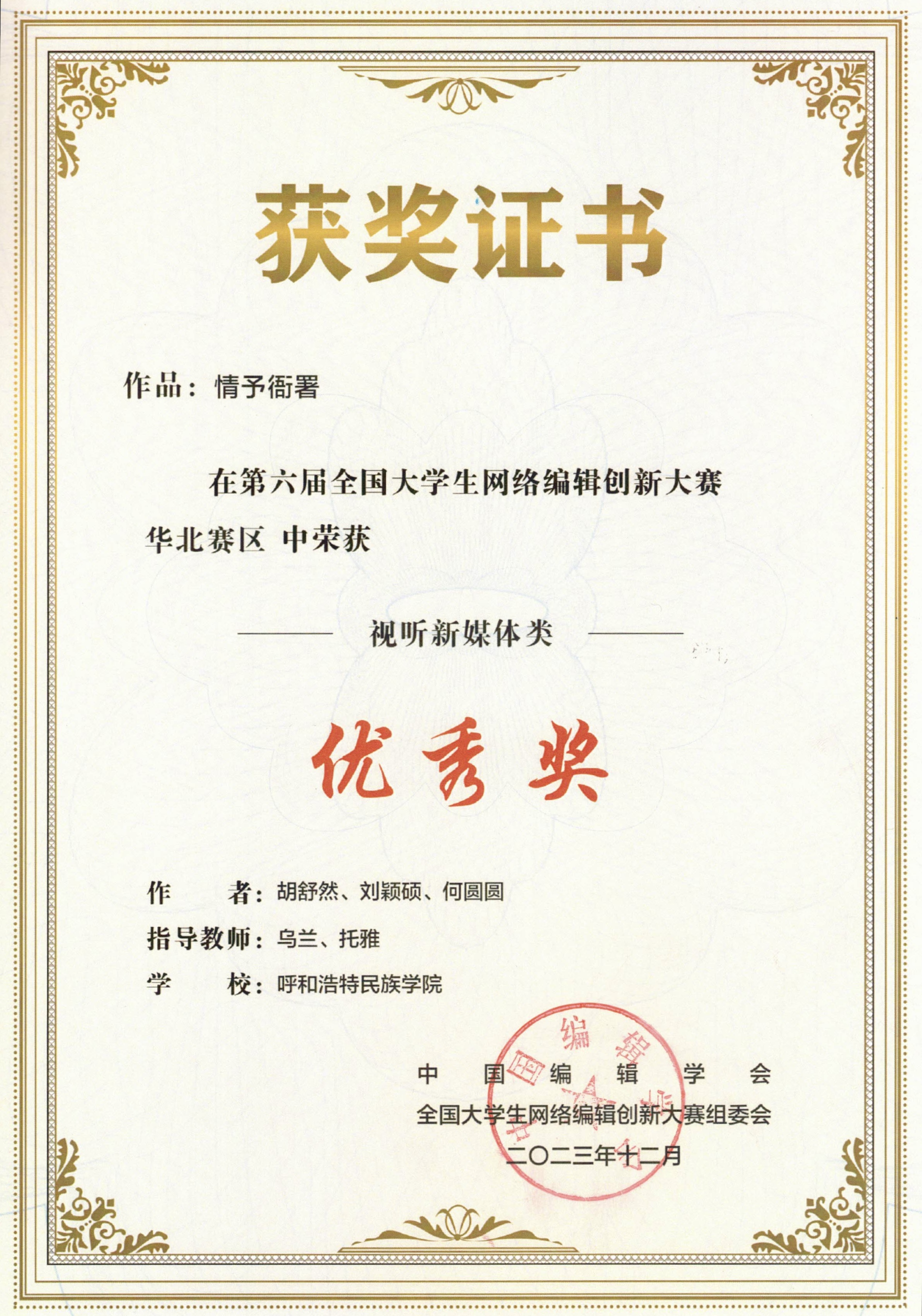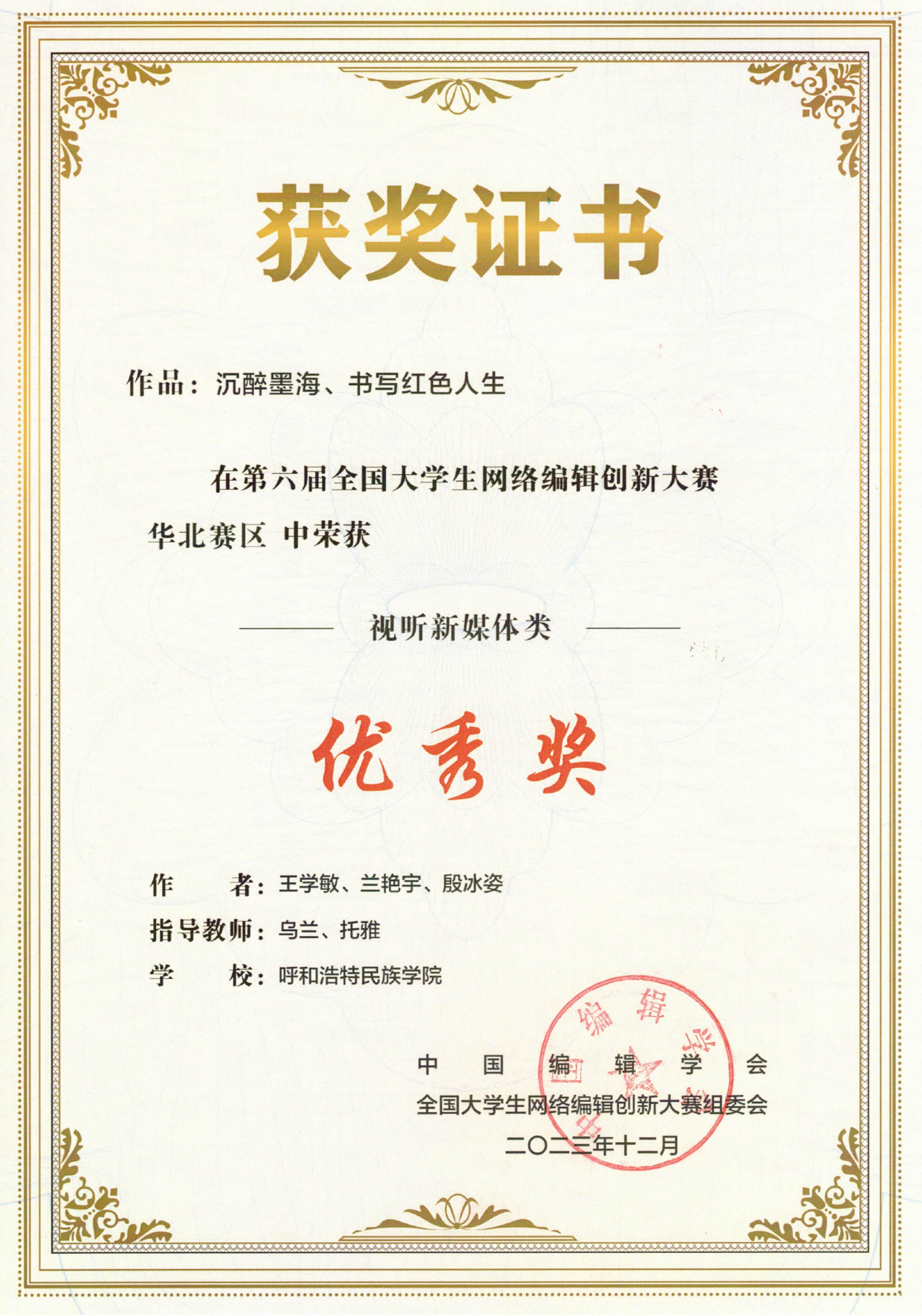 由中国编辑学会主办、中国编辑学会电子网络编辑专业委员会组织、中国传媒大学信息与通信工程学院承办的第六届全国大学生网络编辑创新大赛(华北赛区)结果揭晓,鸭脖新闻传媒学院乌兰老师指导的作品:《情予衙署》(学生:胡舒然、刘颖硕、何圆圆)、《无烧麦不青城》(学生:张丹、班瑞)、《沉醉墨海、书写红色人生》(学生:王学敏、兰艳宇、殷冰姿)均荣获视听新媒体类优秀奖。