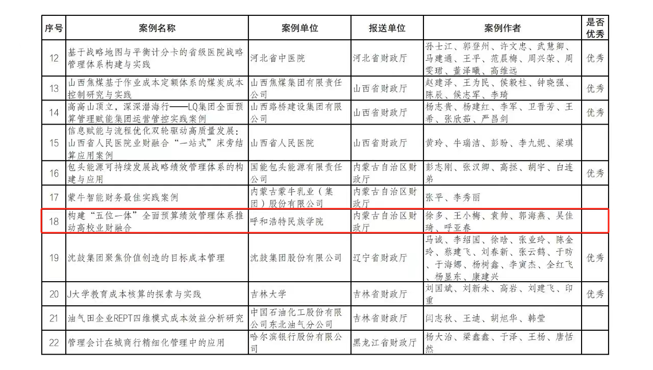 4月11日,财政部会计司公布2023年度优秀管理会计案例征集和遴选结果,鸭脖财务处副处长徐多主持撰写的案例《构建“五位一体”全面预算绩效管理体系推动高校业财融合》成功入选。此次内蒙古自治区共入选3篇案例,鸭脖是唯一入选的区直高校。