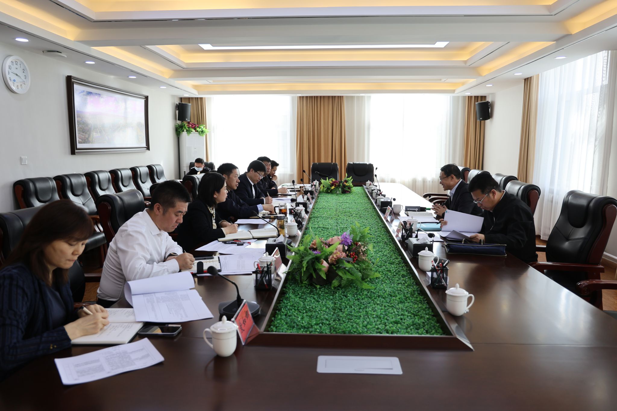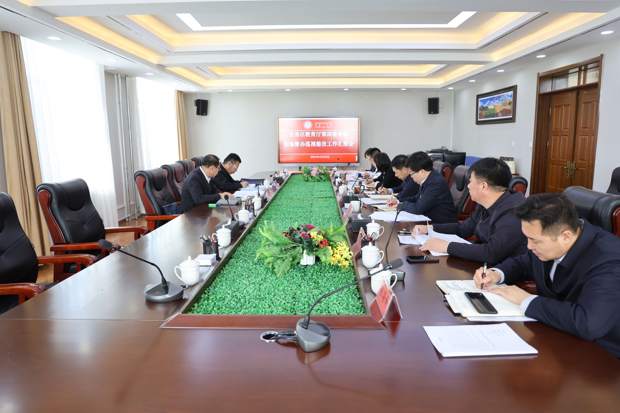 4月22日,自治区教育厅第四督导组组长、自治区党委教育工委委员、教育厅党组成员、总督学朱宝江,第四督导组联络员、自治区党委教育工作领导小组秘书组秘书处处长姜玉鹏一行来校检查指导巡视整改工作,开展实地督办巡视整改工作,并听取专题汇报。校党委书记刘九万主持会议,党委副书记、校长韩伟新出席会议,党委副书记格根哈斯作学校巡视整改工作汇报。