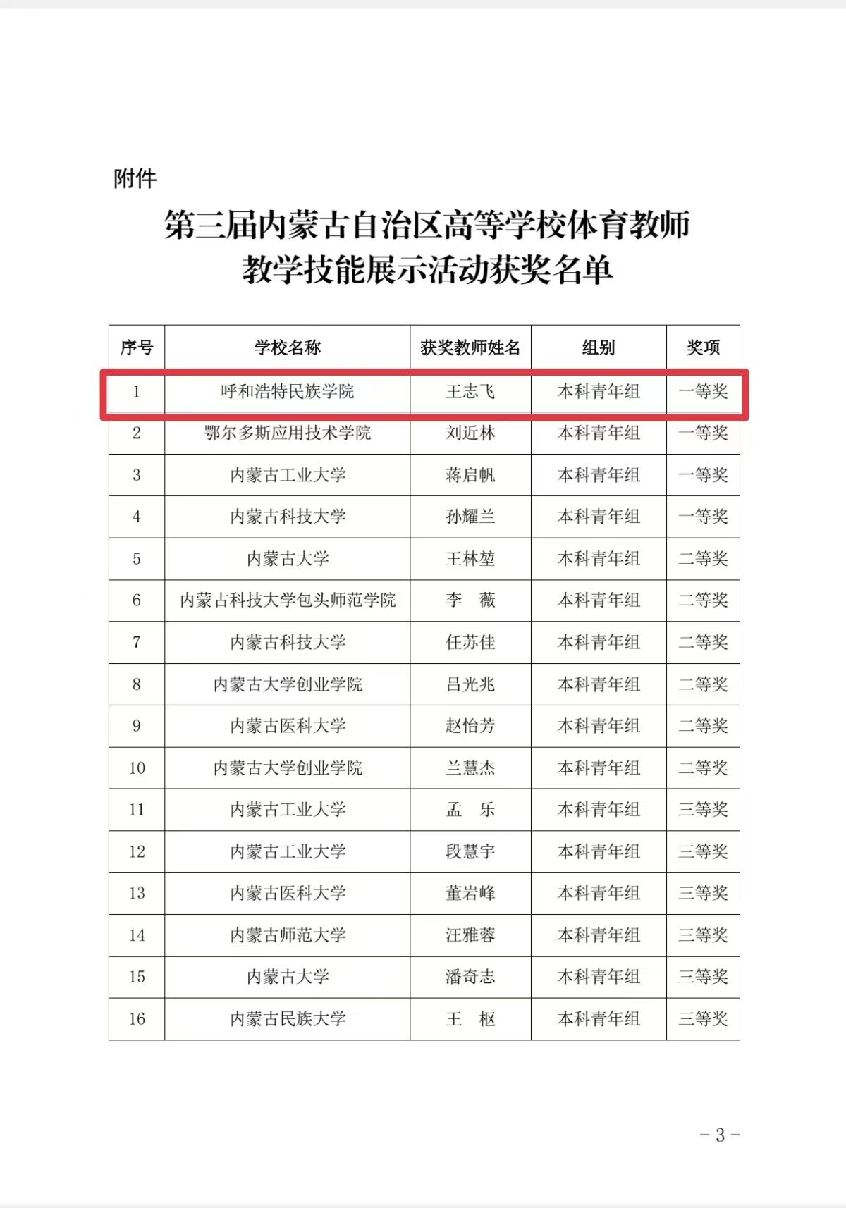 鸭脖体育学院教师王志飞在自治区教育厅主办的第三届内蒙古自治区高等学校体育教师教学技能展示活动中荣获本科青年组第一名。该赛事由自治区教育厅组织区外 16 位全国高等学校体育教学指导委员会专家进行评审,经过网络评审和现场测试两个环节评选而出。