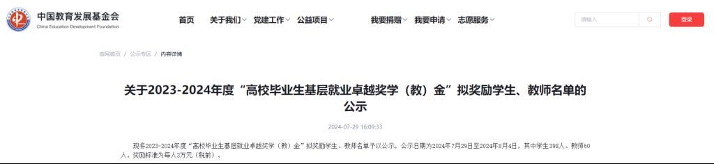 据悉,该奖项由教育部高校学生司(高校毕业生就业服务司)和教育部学生服务与素质发展中心共同指导、中国教育发展基金会设立,旨在贯彻落实党中央、国务院关于引导和鼓励高校毕业生到基层就业的决策部署,奖励赴基层就业创业并作出突出业绩的普通高校毕业生。