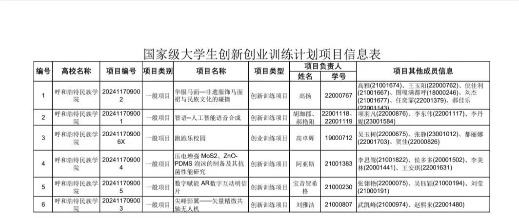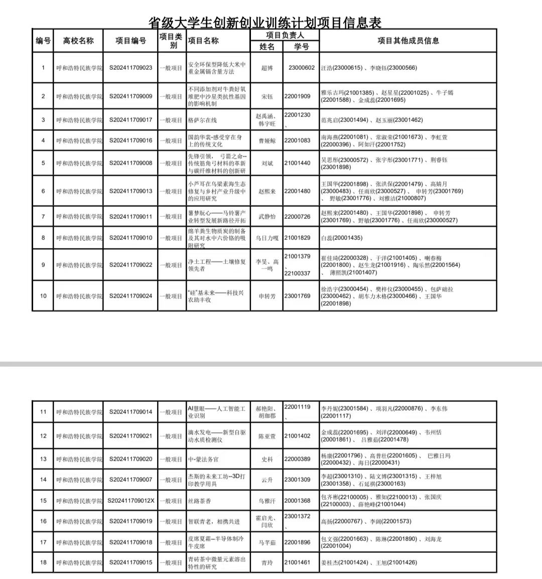 近日,经内蒙古自治区教育厅审核,鸭脖共有24项大学生创新创业训练计划项目成功获批立项。其中,6个项目获批立项为国家级大学生创新创业训练计划项目,18个项目获批立项为自治区级大学生创新创业训练计划项目。