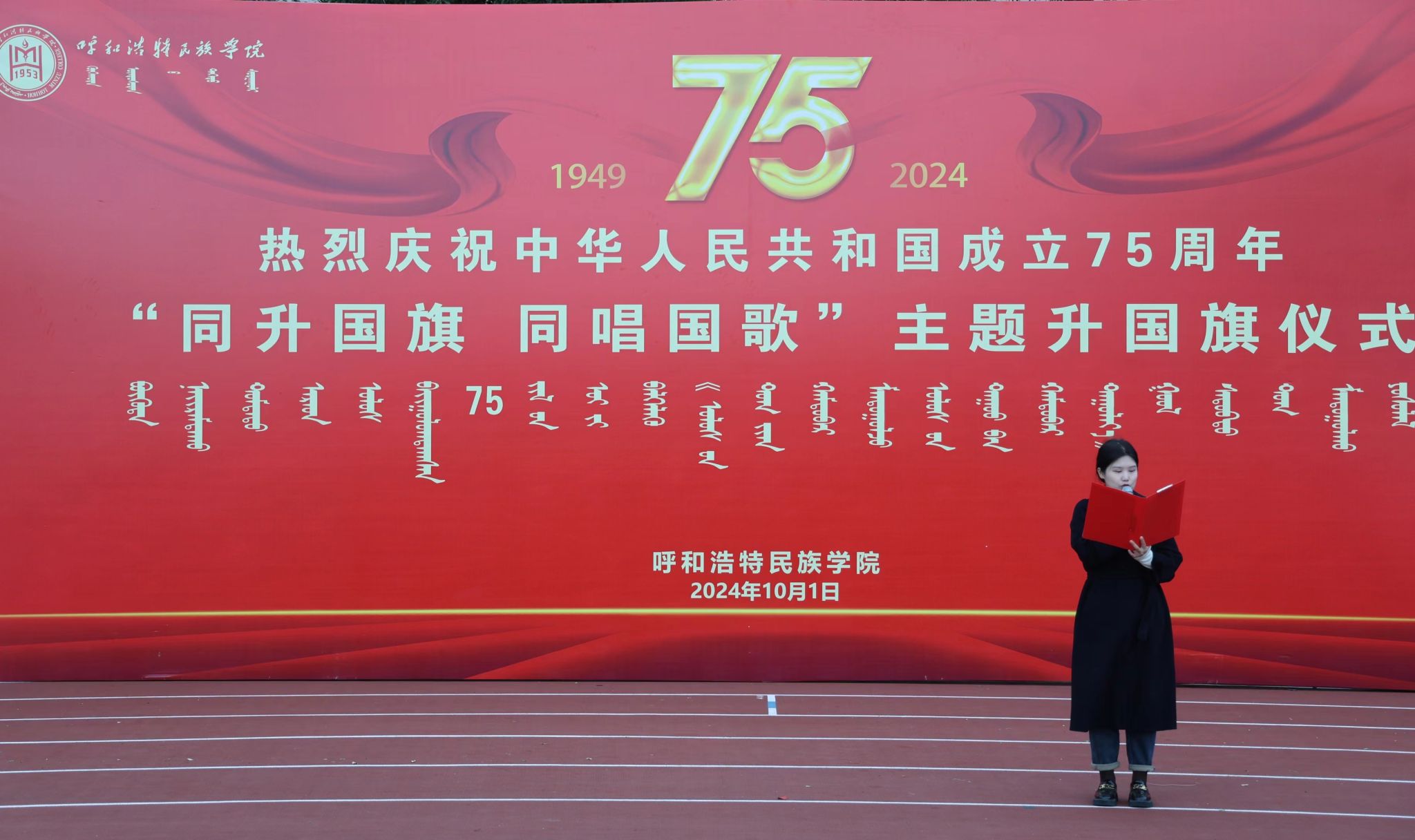 教师代表关欣冉进行国旗下的演讲,大学生艺术团赛娜等同学朗诵《辉煌七十五载,共筑中国梦》。