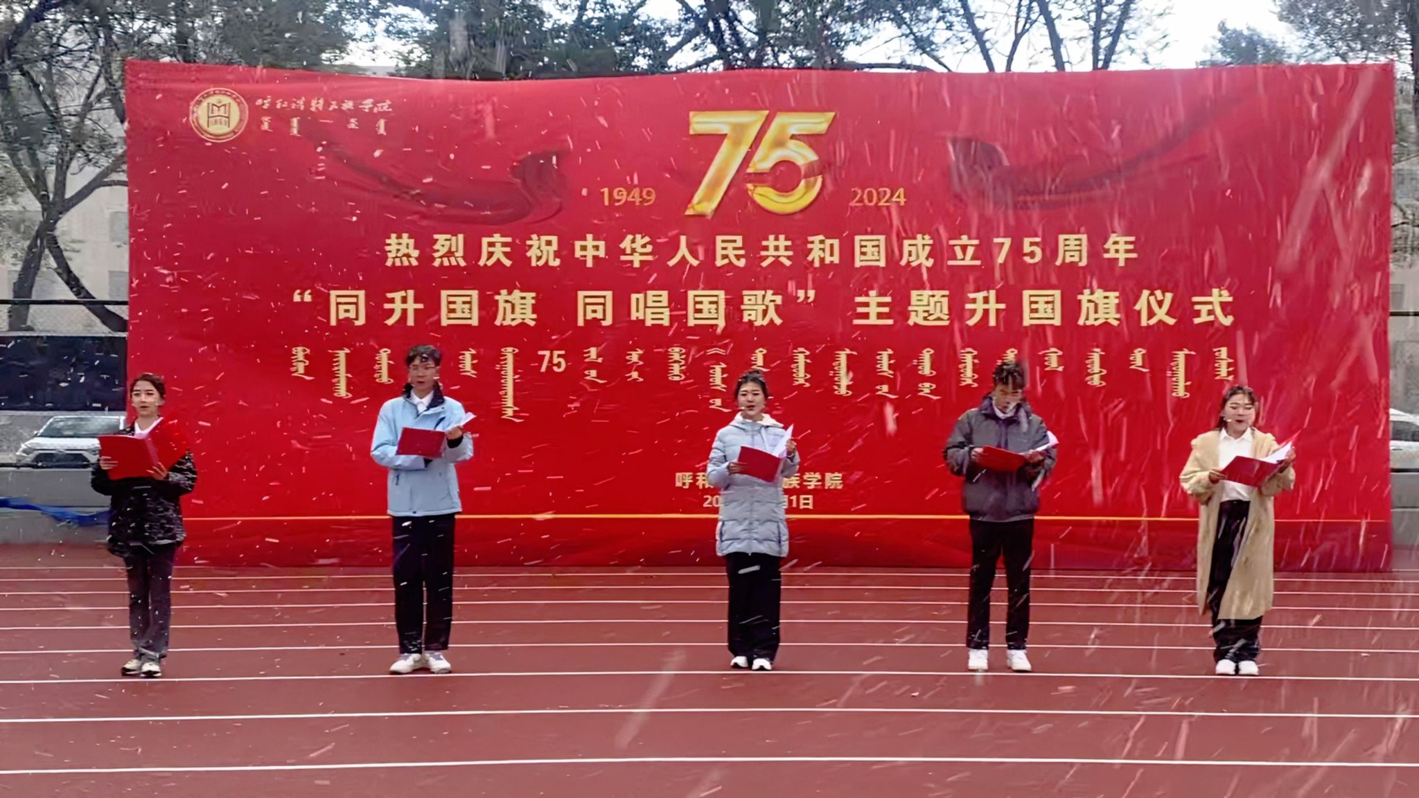 10月1日清晨,学校在南操场举办庆祝中华人民共和国成立75周年“同升国旗,同唱国歌”升国旗仪式。校党委书记刘九万出席仪式并讲话,党委委员、纪委书记、监察专员王冬梅,党委委员、副校长高喜天,党委委员、副校长刘瑞鸿,党委委员、副校长额尔敦布和,党委委员、副校长双虎等全体校领导出席仪式。仪式由校党委副书记格根哈斯主持。