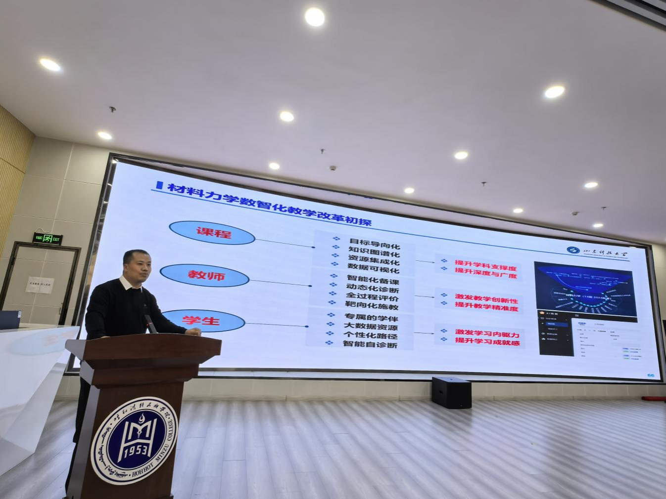 额尔敦布和在致辞中指出,教育数字化已经成为赋能高校课程资源建设的重要驱动力,他号召老师们一要响应国家教育数字化战略行为,把握数字化机遇,充分利用大数据,信息技术应用场景,提高课程建设质量,全方位提高教学的创新性、高阶性和挑战性。二要响应教育教学智能化发展态势,把握智能化机遇,充分利用知识图谱、AI智慧场景,提升课程建设效益,全视角打造教学的新模式、新定位和新增量。