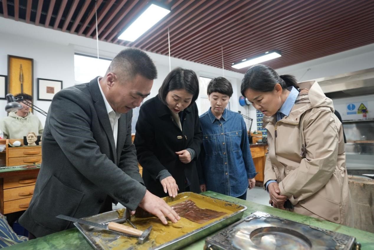 张丽辉就非遗相关项目申报、产学研发、品质提升、搭建平台等方面给予了指导,并建议学校发挥特色优势,进一步加强对“校园那达慕”等特色活动的建设力度,加强开放办学,通过“走出去、请进来”等方式,不断增强非遗专业与相关行业之间的互动交流,依托现有非遗体验场馆,开发非遗研学项目,并通过参与各类展示平台,积极推动非遗文创产品研发,为非遗传承发展探索更加广泛的建设路径,推动学校非遗建设高质量发展。