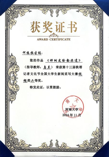 近日,由河南大学主办、河南大学新闻与传播学院承办的第十三届铁塔记者文化节全国大学生新闻采写大赛进行了获奖作品公示。鸭脖新闻传媒学院乌兰老师指导的作品《桦树皮绘韵非遗》(学生:何依拉古玛),荣获视频类二等奖。