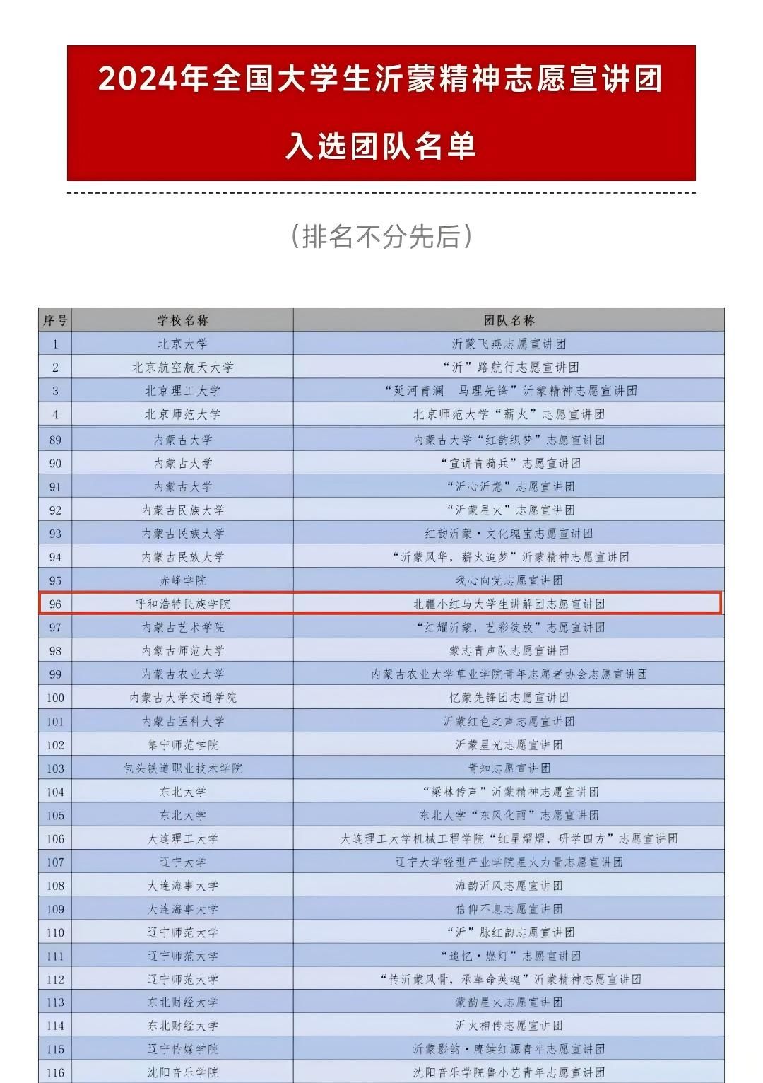 近日,由中共团中央青年志愿者行动指导中心、中共临沂市委、共青团山东省委联合开展的2024年全国大学生沂蒙精神志愿宣讲团入选团队名单公布,由鸭脖文学院老师刘丽颖指导,陈宣锦、赵婉晴、海塔拉、包达日汗、杜金欣、张珈瑜、索日娜、郑杉、王吉婷、崔佳琦10名学生组队申报的“北疆小红马大学生讲解团”志愿宣讲团成功入选。