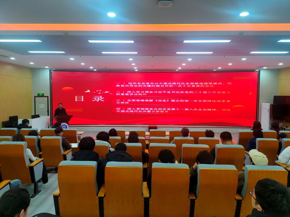 高喜天从充分认识党的二十届三中全会的重要意义、深入学习领会习近平总书记在党的二十届三中全会上的重要讲话精神、全面准确理解《决定》提出的进一步全面深化改革重大举措、深入贯彻落实自治区党委十一届八次全会精神等方面进行深入解读,并就如何落实好全会精神,大力弘扬教育家精神、科学家精神,争做新时代好老师、好青年作出强调。