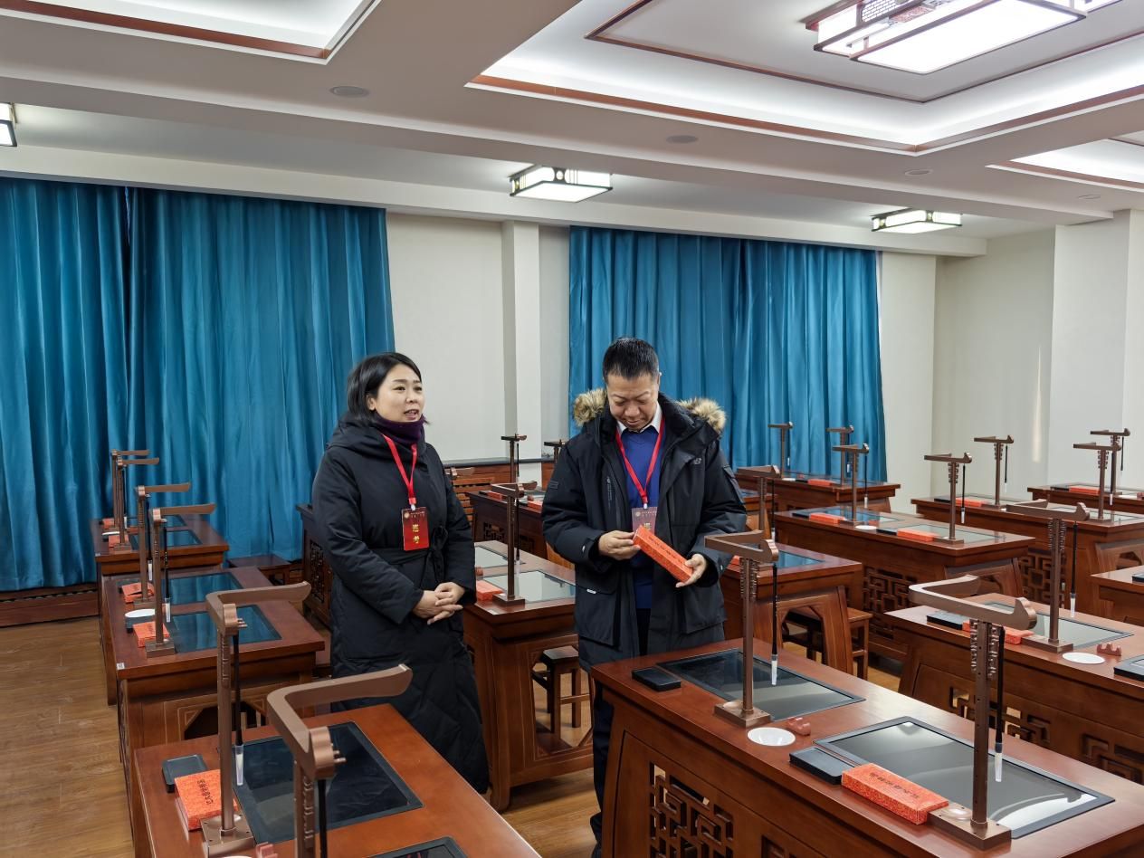 格根哈斯和双虎先后实地察看了综合实训室、智能书法教室、微格教室、VR实训室、教具室、微课制作室和商学院、美术学院、创新创业中心建立的实训室,认真听取了教务处、实验室管理中心和相关学院负责人和实验室负责老师对实验实训室建设规划、改造调试情况和环境条件等方面的汇报。
