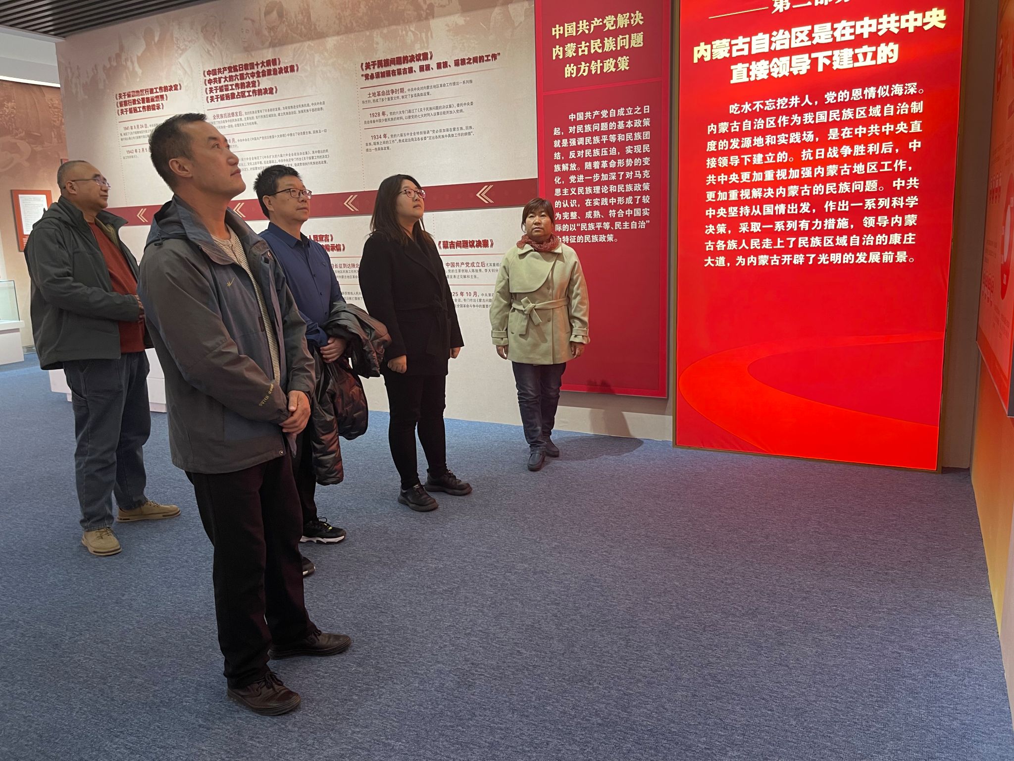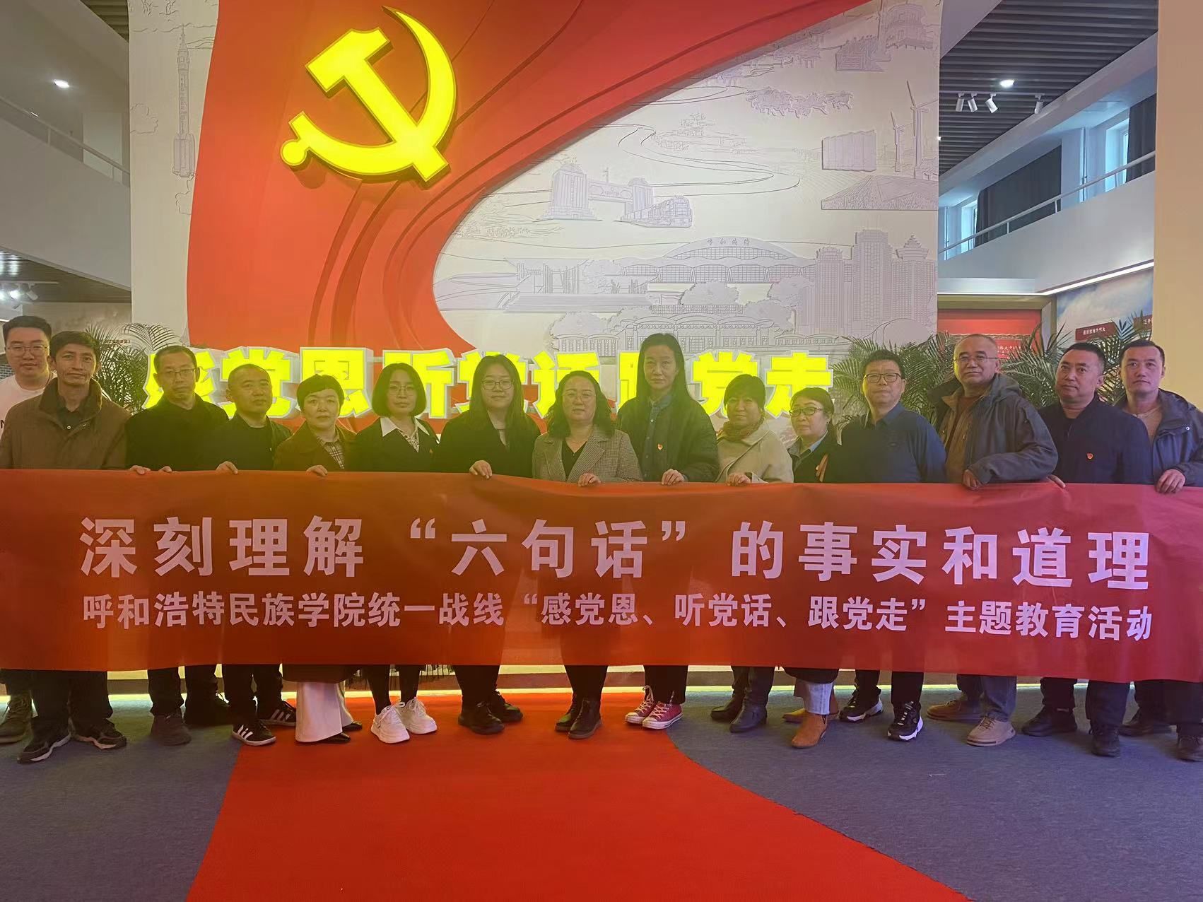 本次展览以铸牢中华民族共同体意识为主线,以“感党恩、听党话、跟党走”为主题,时刻牢记“六句话”的事实和道理,全方位宣传展示了内蒙古在社会主义革命、建设、改革的各个历史时期。在讲解员的带领下,大家观看图片、文字及文献档案展品等内容,认真聆听了中国共产党领导下的内蒙古发展进程和生动感人的民族故事,加深了对“六句话”事实和道理的理解与领悟,大家深切感受到习近平总书记对内蒙古人民的深情厚爱和殷殷嘱托。