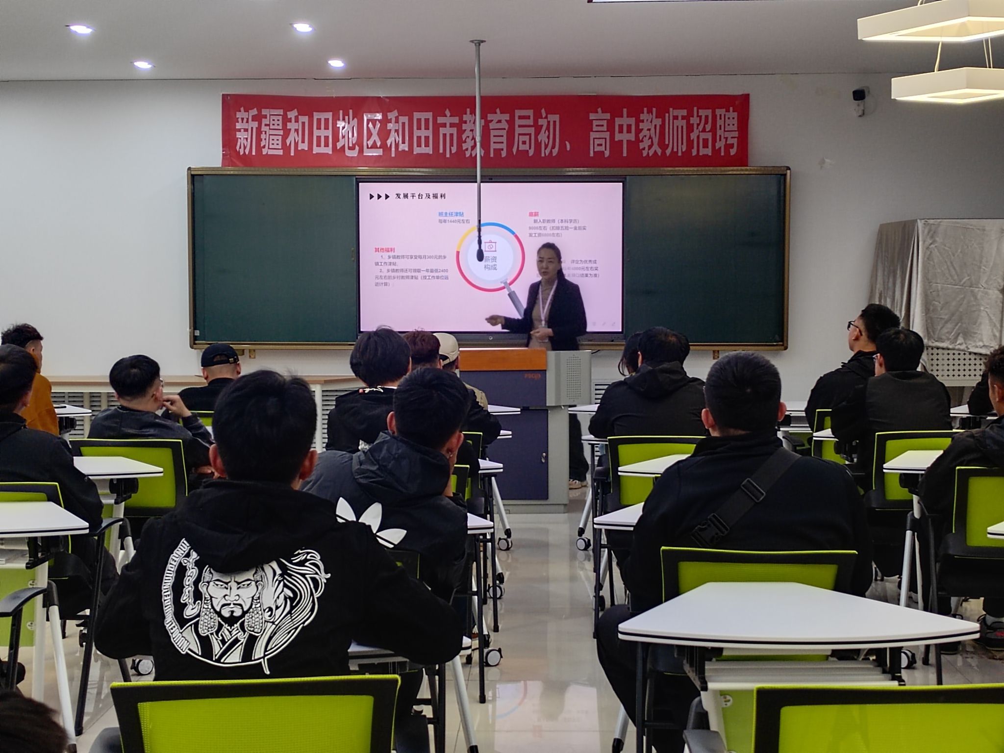 宣讲会上,和田县教师招聘负责人向与会的同学详细介绍了新疆和田地区的政治、经济与人文等方面的基本情况,通过播放宣传片展示了和田教育环境、教育成果、生活环境以及学校风貌,并就和田县2024年教师招聘岗位需求、发展平台、福利待遇、应聘条件等方面做了详细介绍。与会同学对和田县教师招聘表现出了极大的热情,就教师招录细节问题和宣讲老师进行了详细的沟通与交流。