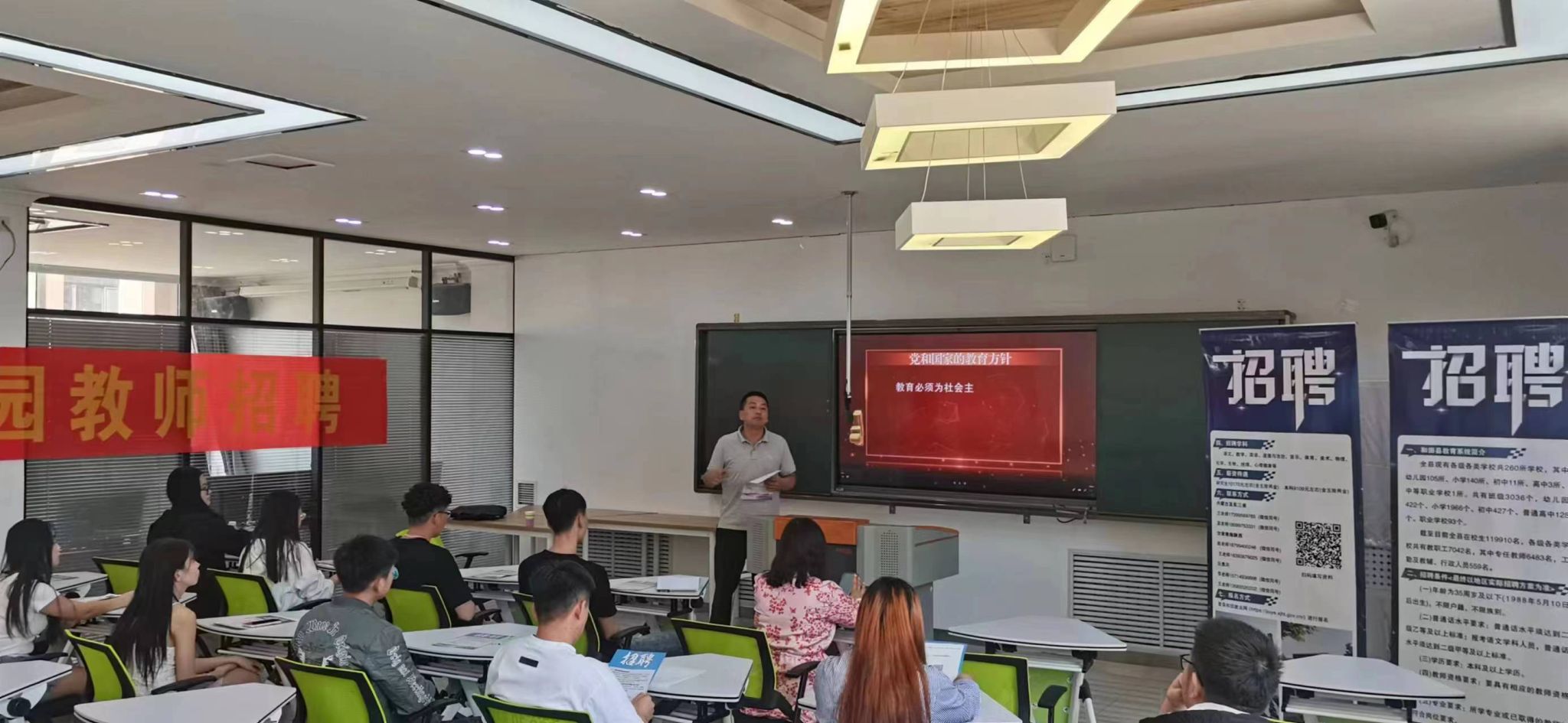 宣讲会上,和田县教育局招聘负责人播放了《和田县教育系统招聘宣传片》,并介绍和田县教育局本次招聘教师报考流程、招聘条件、招聘学段、工作环境、住宿环境及薪资待遇。最后,和田教育局招聘负责人就学生关心的交通、福利待遇、职称评定、在职深造等问题与单位进行答疑解惑。