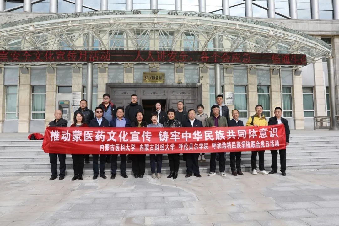 座谈交流会后,四所高校共同开展了“推动蒙医药文化宣传 铸牢中华民族共同体意识”联合党日活动,参观了内蒙古医科大学蒙医药博物馆。