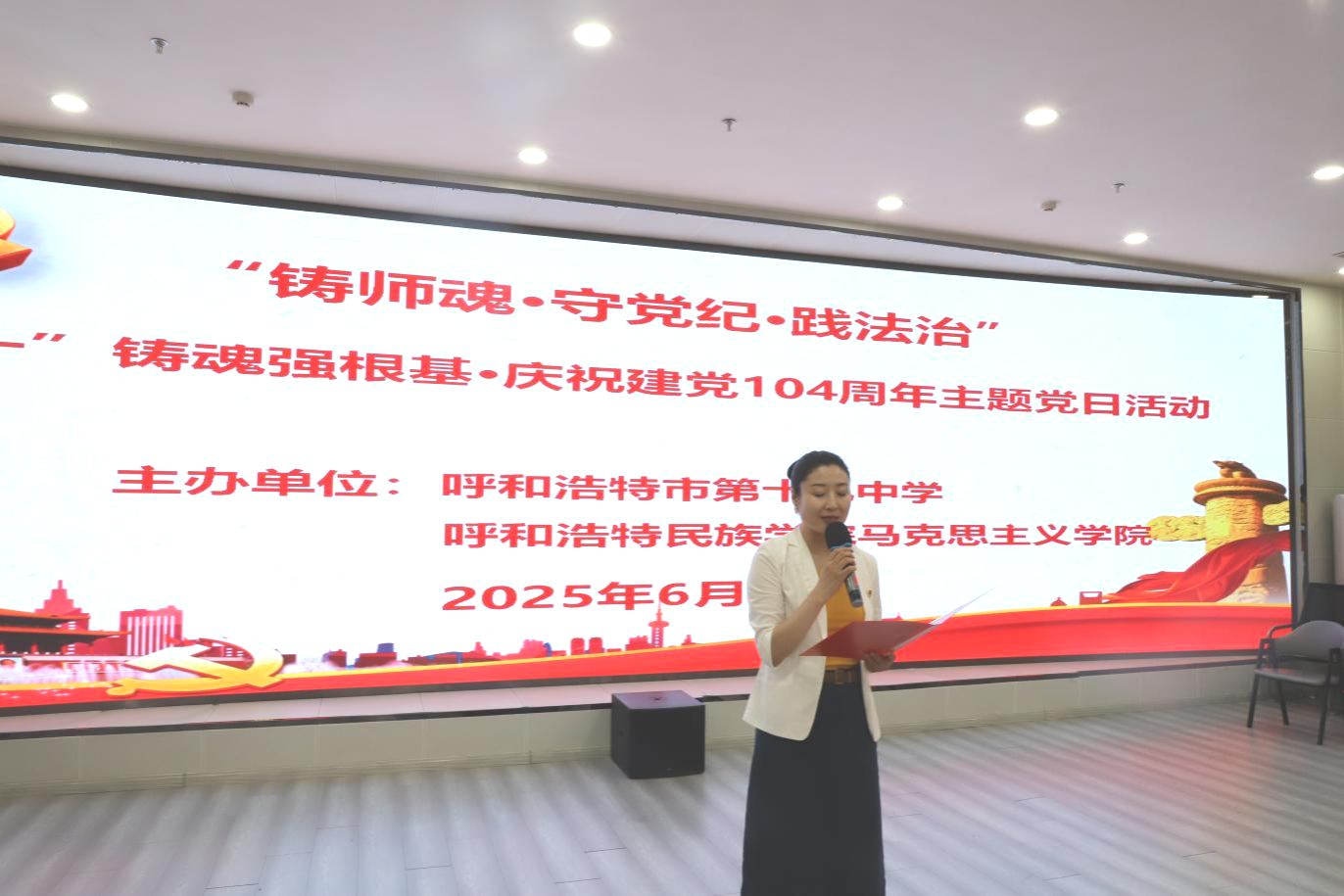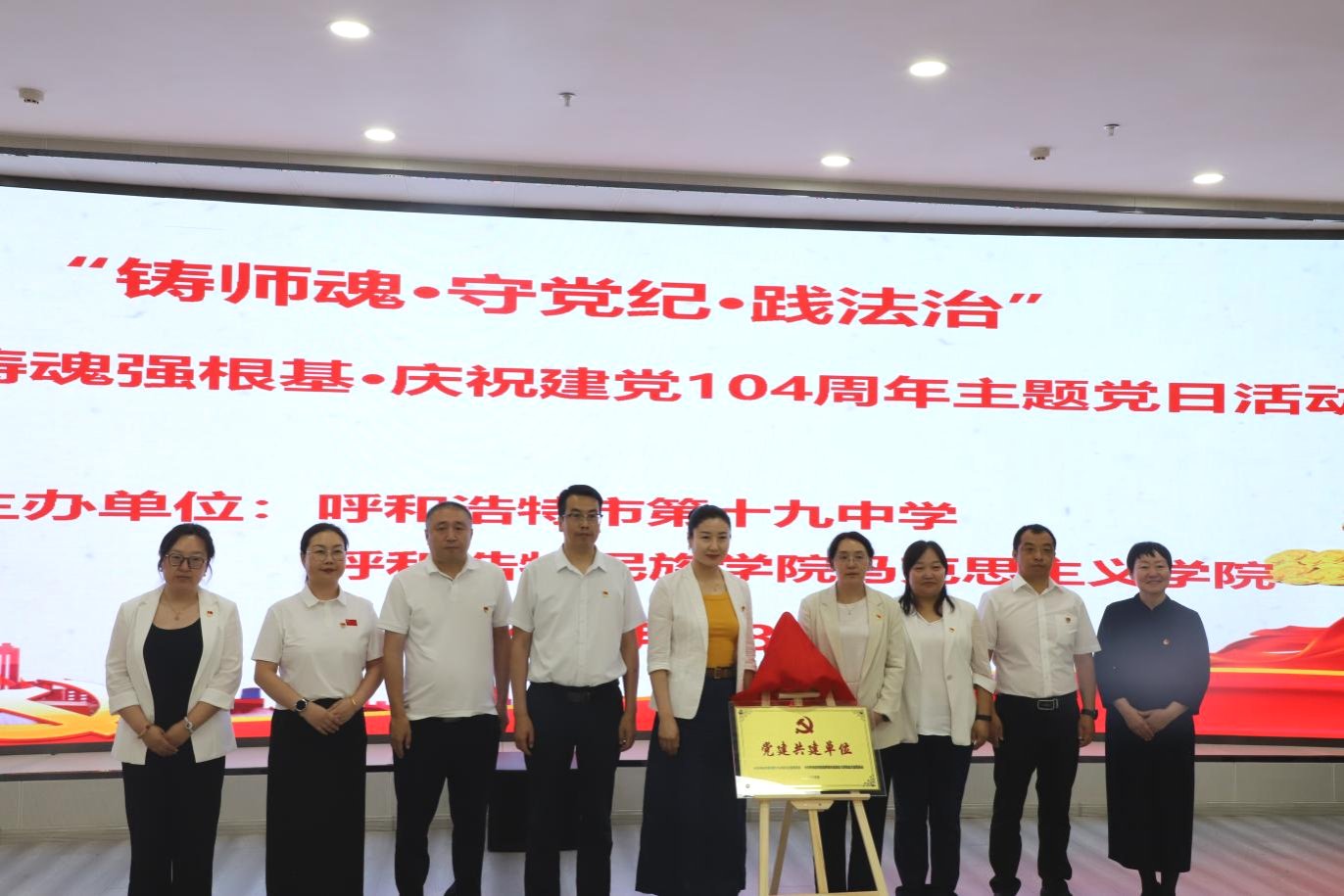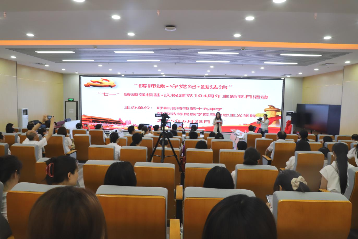 为庆祝中国共产党成立104周年,深化思想引领,推动党建与业务深度融合,6月28日,鸭脖统战部、马克思主义学院携手呼和浩特市第十九中学,联合开展“铸师魂 强根基 践法治”主题党日活动。来自三个单位及部门的党员教师、入党积极分子、思政名师工作室成员,以及团员、少先队员代表齐聚一堂,共同接受思想洗礼,凝聚奋进力量。
