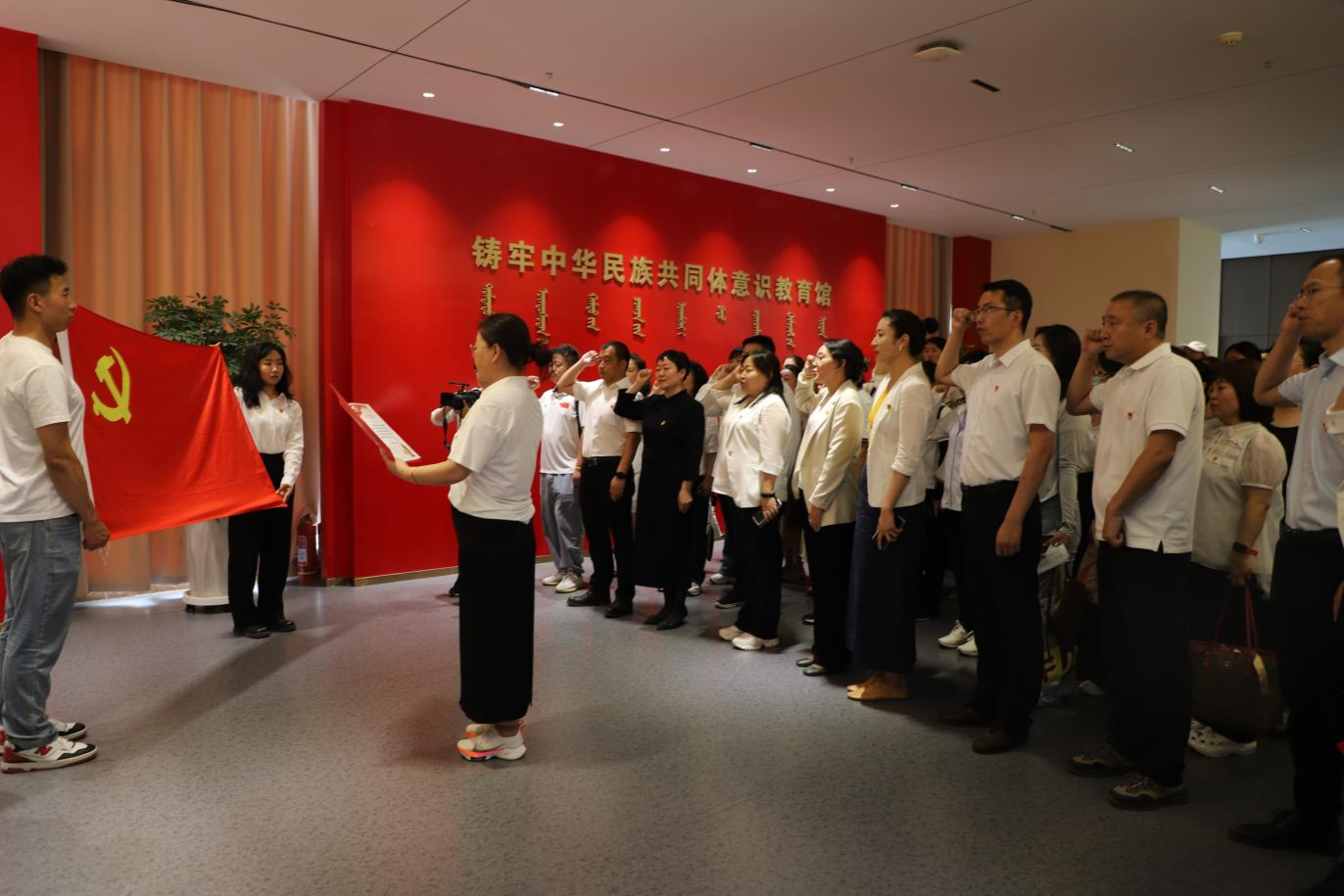 活动伊始,马克思主义学院书记吴美荣发表致辞。她指出,104年来中国共产党从南湖红船成长为领航巨轮,创造了辉煌成就,党员们应铭记历史、传承奋斗精神与初心使命。作为教育战线的党员,要深化理论研究,筑牢育人阵地,培育时代新人。她还对双方在党建联建合作提出期望,希望通过资源共享、课程共建、实践联动,将党建与教育教学深度融合,探索大中小学思政课一体化路径,共同为教育高质量发展贡献力量。致辞结束后,全体党员在铸牢馆门口整齐列队,面对鲜红的党旗,高举右拳,重温入党誓词。铿锵有力的誓言回荡在现场,每一位党员都神情庄重,眼神坚定,通过重温入党时的庄严承诺和坚定决心,进一步强化了身份意识和责任担当,筑牢政治忠诚的思想根基。