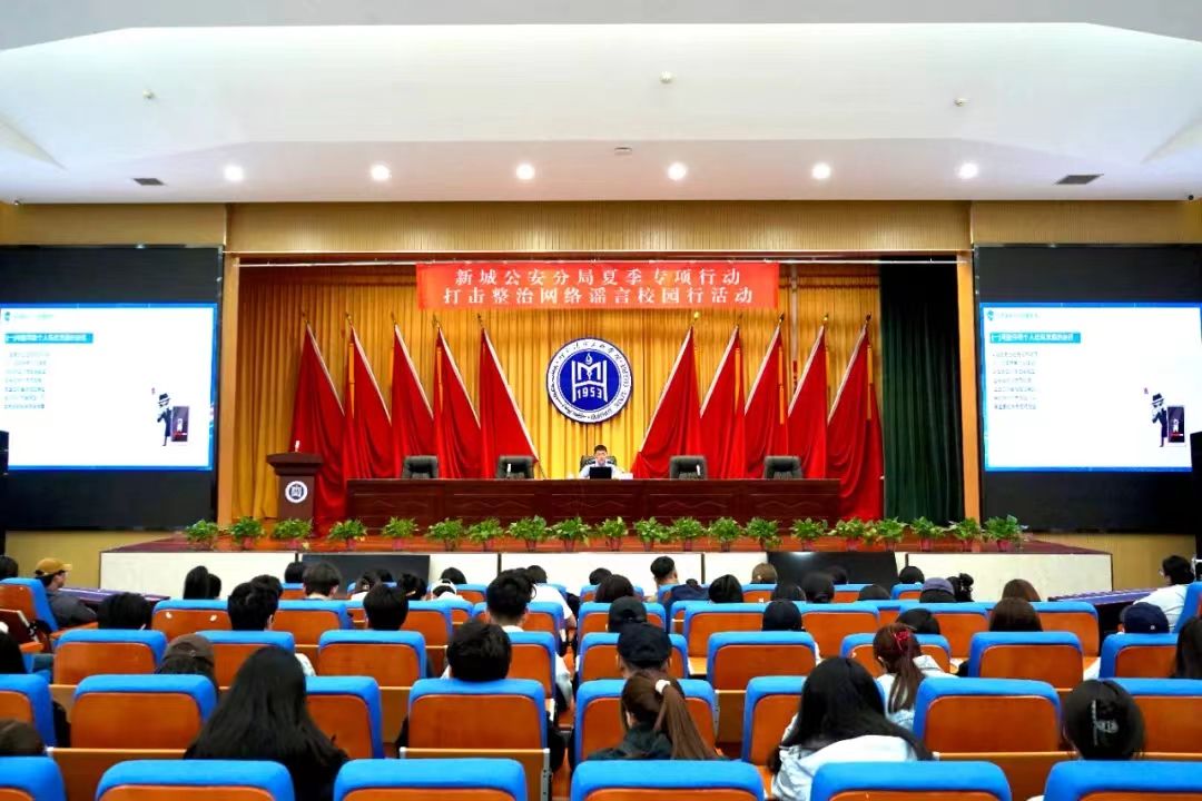 为深入推进国家网络信息安全周活动,教育引导青年学生牢固树立网络安全意识,筑牢网络安全屏障,9月11日下午,校团委邀请新城区公安分局网安大队张臣皓警官来鸭脖作“网络安全为人民,网络安全靠人民”专题讲座。校团委全体成员及各学院学生代表200余人聆听讲座。