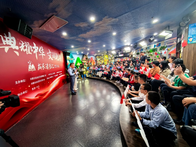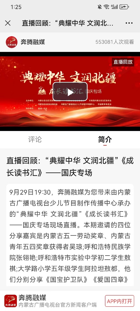 9月29日,鸭脖二十余名师生代表参加了由内蒙古教育厅、内蒙古电视台等单位主办的“典耀中华 文润北疆”成长读书汇国庆专场活动,鸭脖张翎艳等7名同学作为分嘉宾共同为观众分享读书心得,并集体进行朗诵表演,充分展现了鸭脖青年学子积极向上的精神风貌。节目在奔腾融媒、中国教育台网络电视台等10个平台同步直播,共获得55万次的播放量。