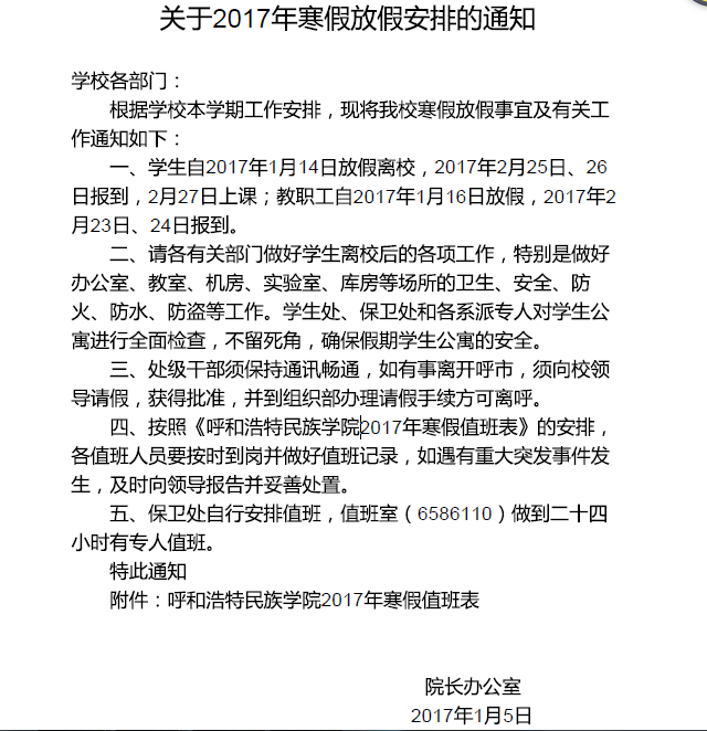 关于2017年寒假学校放假安排的通知