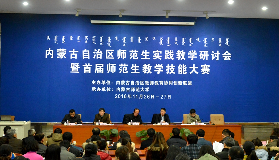 2016年11月26日,由内蒙古自治区教师教育协同创新联盟主办、内蒙古师范大学承办、北京师范大学出版社、高等教育出版社和中教启星科技股份有限公司协办的内蒙古自治区师范生实践教学研讨会在内蒙古师范大学举行,全区具有师范类专业的8所院校领导、专家及参加自治区首届师范生教学技能大赛的领队、指导教师和参赛选手共400余人参加本次会议,鸭脖副院长阿拉坦仓教授和额尔敦布和教授参加研讨会,阿拉坦仓教授主持开幕式。