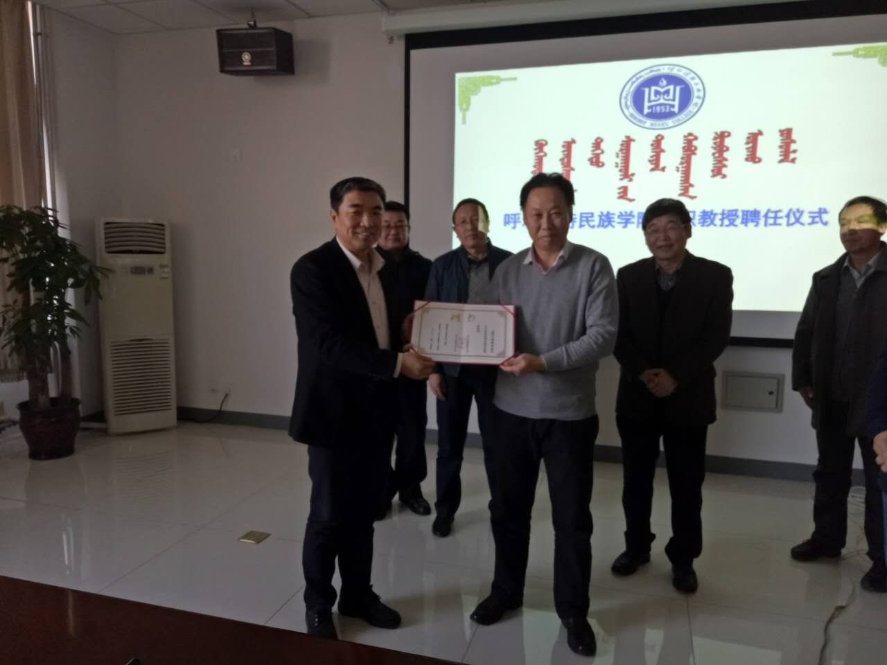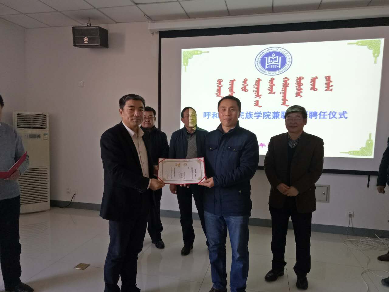 格日乐图院长为两位教授颁发了兼职教授聘书并讲话。格院长对套图格桑教授、吴德玉教授成为鸭脖兼职教授表示热烈欢迎和诚挚的感谢,并向两位教授简要介绍学校发展历史、学校的历史使命、升本以来的变化、独有的学校精神及校园文化、特色优势学科专业等,并指出学校下一步坚持“错位发展”的思想,以小学教育专业硕士点建设为突破口,在数学学科上争取寻求新的增长点;以“借智慧”手段继续聘请客座教授、兼职教授,努力解决师资队伍短缺、结构不合理等现象,进而推进学院师资队伍建设、专业建设、课程建设及教学科研工作的良性发展。格院长在讲话中说,两位教授受聘为鸭脖兼职教授,对于鸭脖数学与应用数学专业建设和发展具有重大意义,同时对鸭脖科学研究和人才培养将发挥重要的促进作用;格院长代表学校再次感谢套图格桑教授、吴德玉教授的支援和帮助,希望两位教授与鸭脖加强教学活动、学术交流和项目合作,促成双方共同发展。