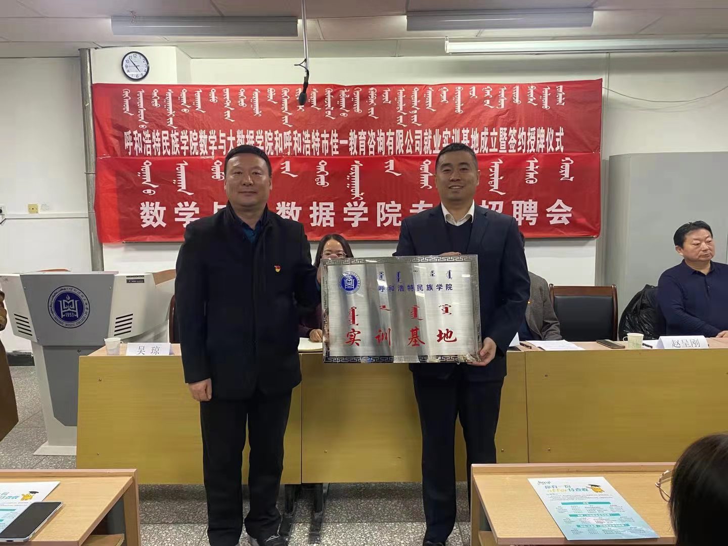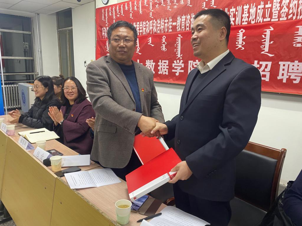 仪式上,我院代表布和朝鲁书记与佳一教育代表赵呈刚先生签订实训基地合作书,鸭脖就业指导处处长包仓老师向佳一教育负责人授予实训基地牌匾。数学与大数据学院院长王海清教授和佳一教育内蒙古区域总监赵呈刚先生先后致辞。