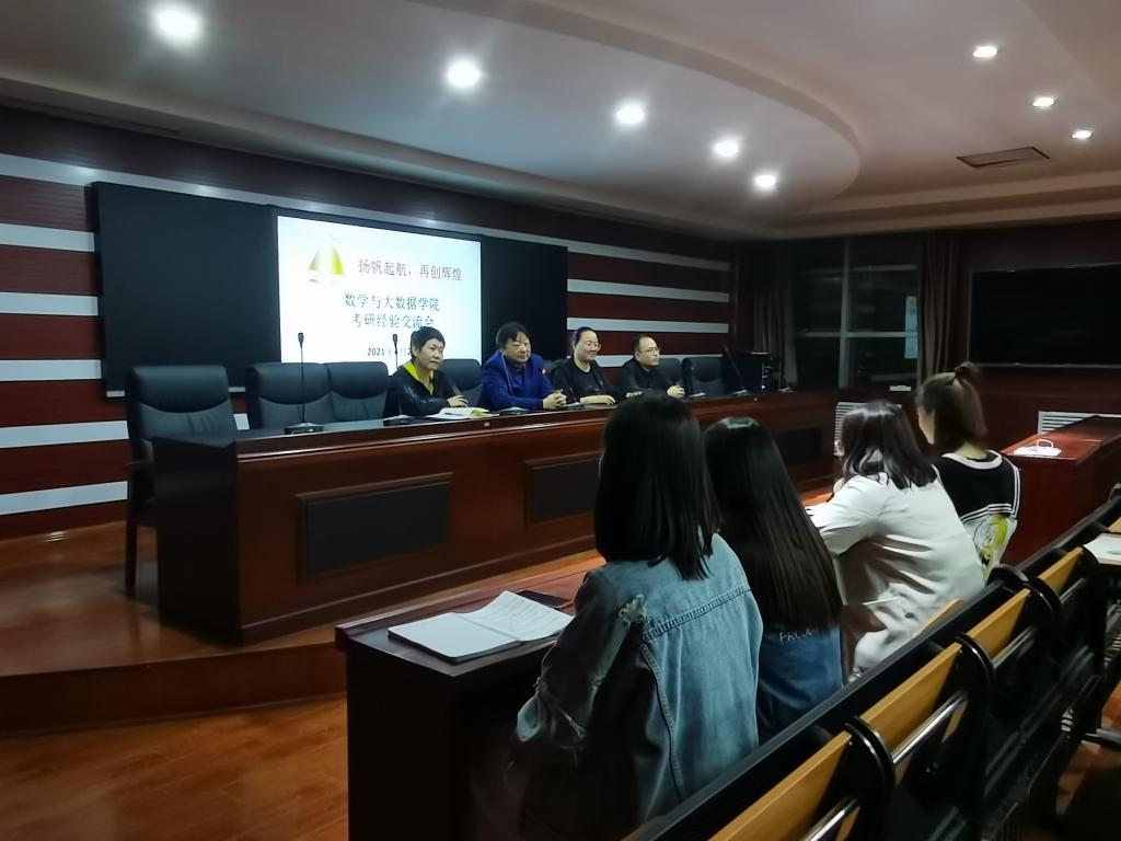 会议首先由数学与大数据学院院长王海清发表了讲话,他对考研成功的学生取得的优异成绩给予了高度肯定和深深祝贺,接着深入分析了当下的考研形势,并鼓励同学们积极考研,努力拼搏,把握机会。其次,由考上研究生的四名同学分别就专业课和政治英语的考研学习内容、学习方法、时间安排以及选学校选专业等方面分享了自己的宝贵经验和心得体会,结束之后一一解答了同学们在备考路上遇到的种种难题。最后副院长额尔敦其其格讲道:“要把握和珍惜在校学习的良好条件,扎扎实实学好每一门课程,尽早确定自己的报考方向,明确奋斗目标,脚踏实地、专心致志把备考的过程作为夯实自我、提升自我、发展自我的途径之一,努力实现自己远大的理想和抱负。”党总支副书记郝喜凤讲道:“希望考上研究生的同学珍惜宝贵的升学深造机会,谦虚谨慎,戒骄戒躁,把自己的眼界放宽一些,知识面要广博一些,从新的环境中再次脱颖而出,取得更大的成绩。低年级立志考研深造的同学们借鉴学姐们的考研经验,以考上研同学为榜样,把勤奋学习作为人生进步的阶梯,将学姐们的方法、经验善于运用于自己的考研实践,认真做好考研准备。”