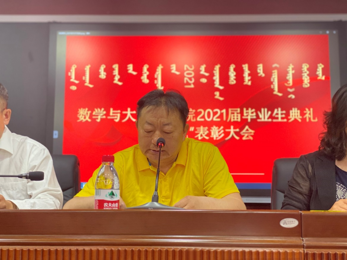 2021年是极赋时代意义的一年,是十四五规划的开局之年,也是中国共产党建党100周年华诞。在这个特殊的年份,数学与大数据学院于2021年6月15日晚上在尚智楼4楼报告厅隆重举行2021届学生毕业典礼暨“六优”表彰大会,学院院长王海清教授、组织部副部长兼2017级小学教育2班班主任白秀副教授、大学数学与数学教育教研室主任兼2017级小学教育1班班主任敖民老师、学工办主任刘爱春老师、团总支负责人于佳晖老师及部分教师代表出席会议,2021届全体毕业生及部分在校生代表参加了会议。会议由学院党总支副书记郝喜凤主持。