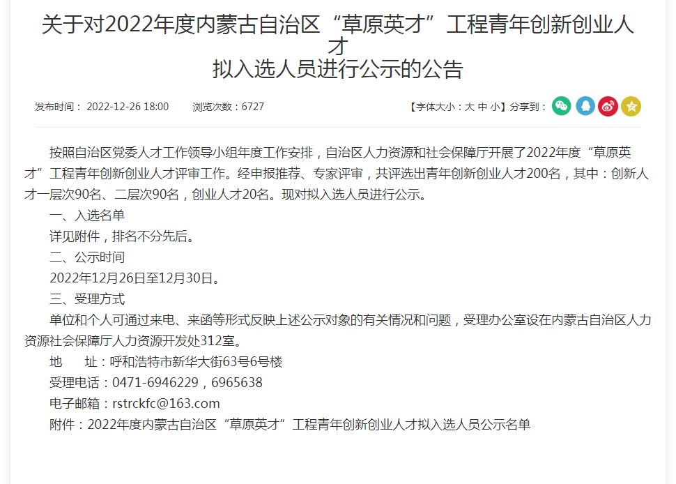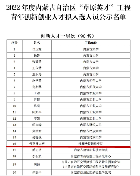 近日,内蒙古自治区人力资源和社会保障厅发布了《关于对2022年度内蒙古自治区“草原英才”工程青年创新创业人才拟入选人员进行公示的公告》。我院何斯日古楞教师入选创新人才一层次人选。