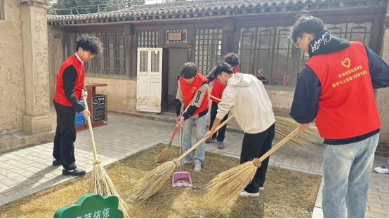 支部活动结束后,志愿者们领取工具,有序地进行打扫故居里亭、清扫庭院落叶等一系列工作。