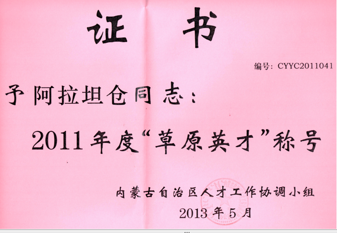 13. 人才工程:2011年内蒙古自治区“草原英才”称号证书(获得者:阿拉坦仓)