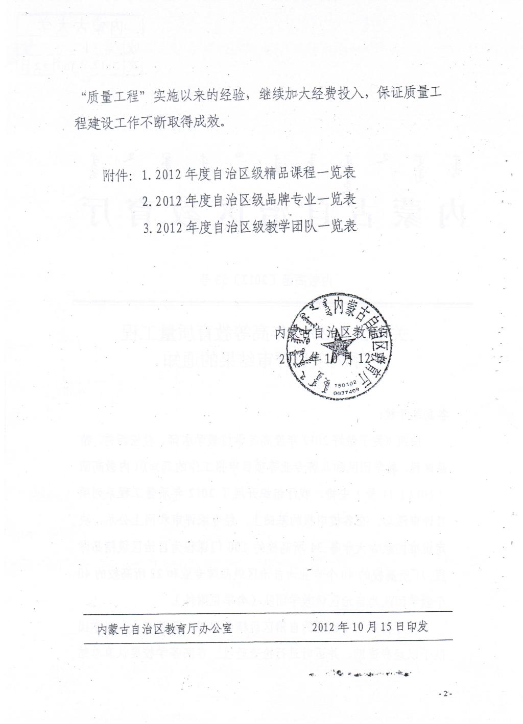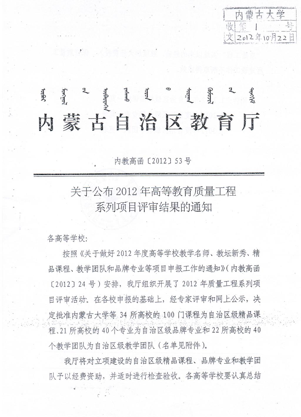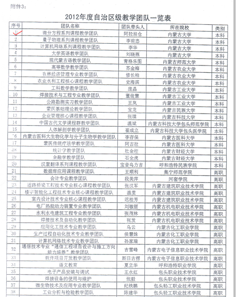 5. 团队建设:关于公布2012年高等学校教质量工程系列项目评审结果的通知—教学团队(负责人:阿拉坦仓)