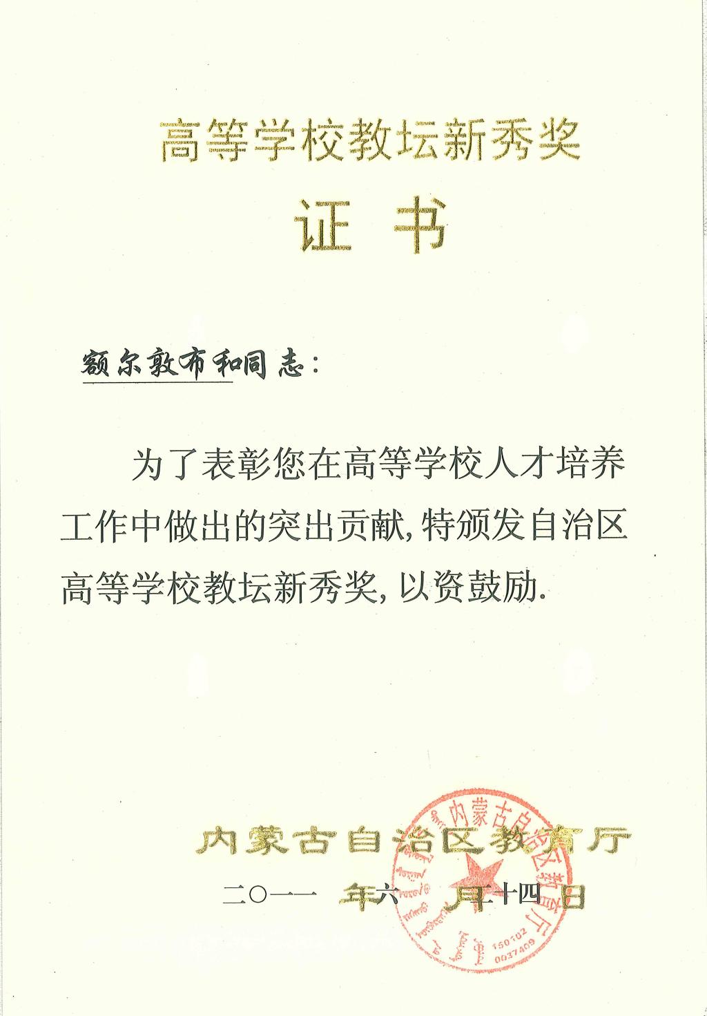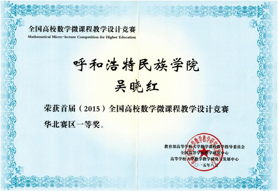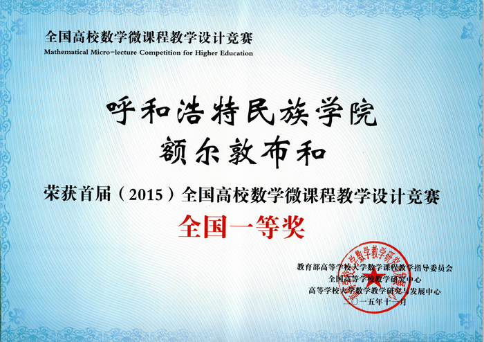 3. 多次获全国高校数学微课教学设计竞赛一、二等奖及华北赛区特等奖。额尔敦布和的“第一型曲面积分的计算法”微课在爱课程网上推广,并在“2015年北京高校数学教师暑期培训会”、“全国少数民族数学教育研讨会”上展示,取得良好效果。