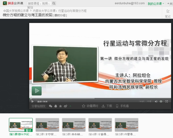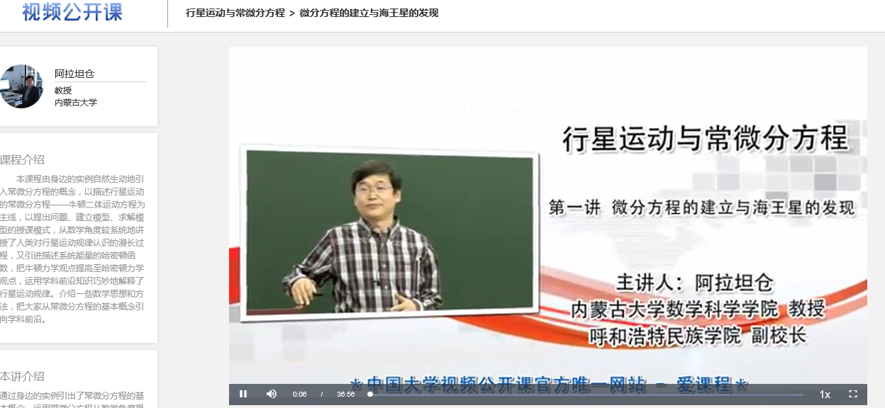 2. 2013年,阿拉坦仓主讲的《行星运动与常微分方程》课入选国家级精品视频公开课,在爱课程网、网易公开课上推广。应高等教育出版社和北京高校数学教育发展研究中心的邀请,阿拉坦仓在“2016年北京高校数学教师暑期培训暨第二届华北赛区微课比赛颁奖会”等上作报告,赢得广泛赞誉。