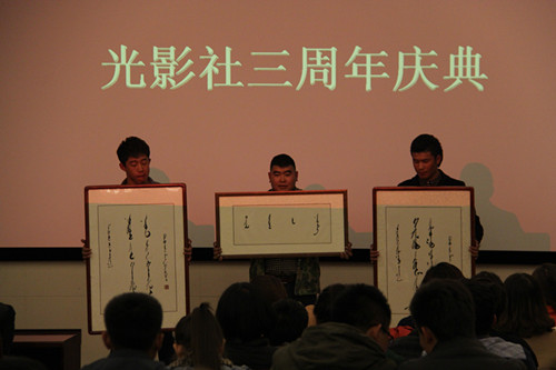 晚会展示了“鄂尔多斯市摄影协会”和“光影社”的若干优秀摄影作品供师生鉴赏。随后,同学们进行了小品、歌曲表演、诗歌朗诵等精彩的文艺节目。“光影社”还收到了著名书法家包金山老师的题词。