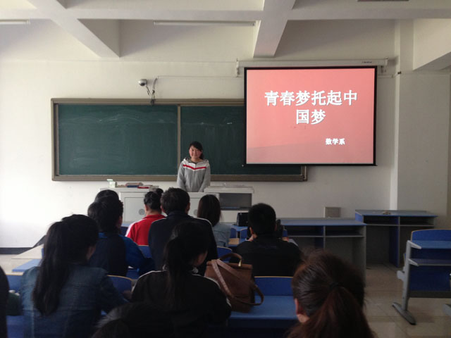 数学系于2014年5月10日举办了一次师生座谈会。讨论学习习总书记讲话精神,我们深深感受到了习总书记对青年大学生的亲切关怀和殷切期望。他说,大学生要养成肯吃苦、肯学习、肯实践的精神,把理想信念化为实际行动,把个人梦想融入中国梦之中。