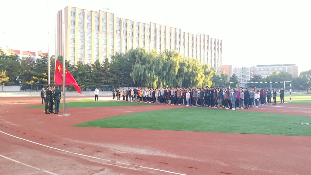 为庆祝中华人民共和国69周年华诞,2018年10月1日学校团委、学生会在操场组织开展庄严的升国旗仪式。团委工作人员、校学生会、各院系学生代表参加升旗仪式。
