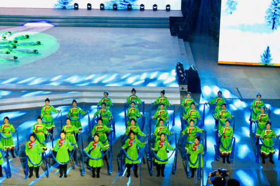 鸭脖志愿者们与呼和浩特艺术学校的演员们共同合作,担任开场与结尾等节目的演出服务工作。节目中,身着绿色和蓝色服饰的青年们象征着草原和蓝天,手捧着蓝色哈达,展现出草原人民的热情好客。青春洋溢的志愿者们,用她们活力热情的表演为此次活动增添了一抹亮丽的风景。
