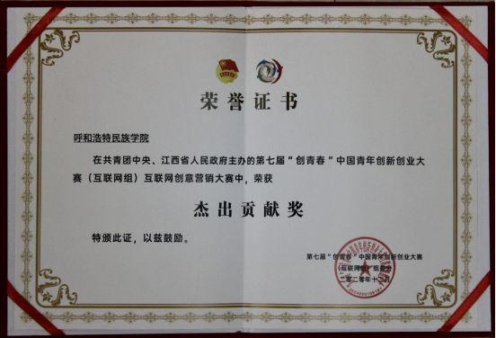 2020年12月11日,由共青团中央、江西省人民政府主办,共青团江西省委、共青城市人民政府、京东集团等承办的第七届“创青春”中国青年创新创业大赛(互联网组)— 创青春互联网创意营销大赛历3个月圆满结束。本次比赛覆盖大学生人数超过1500万,共计来自1200多所高校的2万多支参赛队伍参与,各高校参赛队伍直播场次超过2万场。大赛共决出10个金奖、34个银奖、76个铜奖、10个优秀组织奖和50个杰出贡献奖。