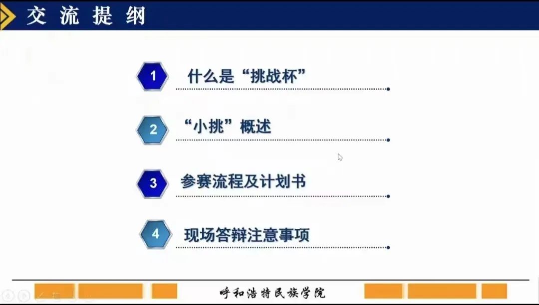 陈玉珍导师从“挑战杯”系列赛事的概述、赛事历程、参赛流程及计划书撰写、现场路演答辩注意事项等四个方面进行了详细的说明与指导。